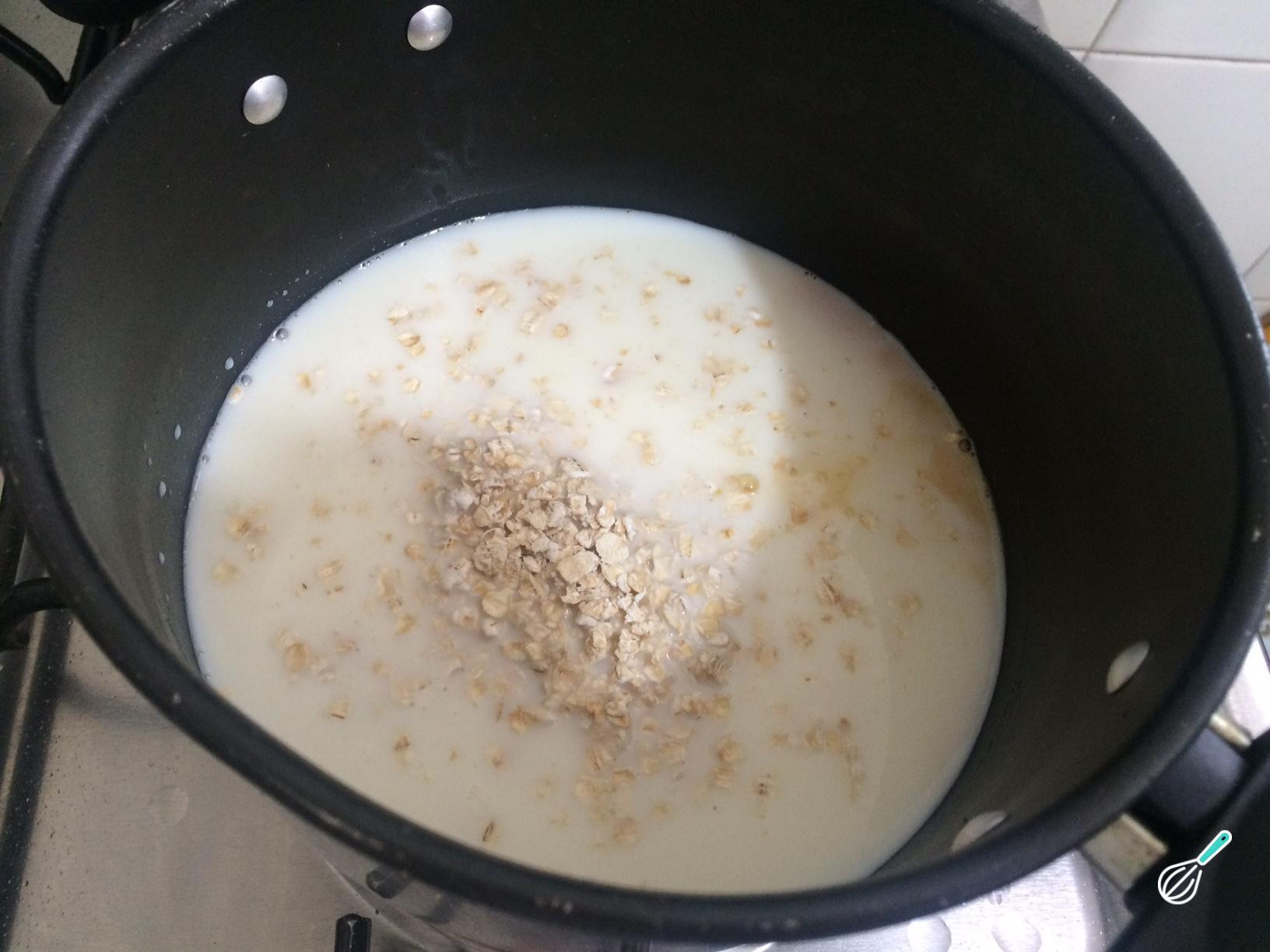 Numa panela junte a aveia com o leite, a essência de baunilha, a canela em pó e uma colher de sopa de açúcar. Misture tudo bem e deixe cozinhar em lume brando por 10 minutos, até obter um mingau de aveia grosso, mas suave.