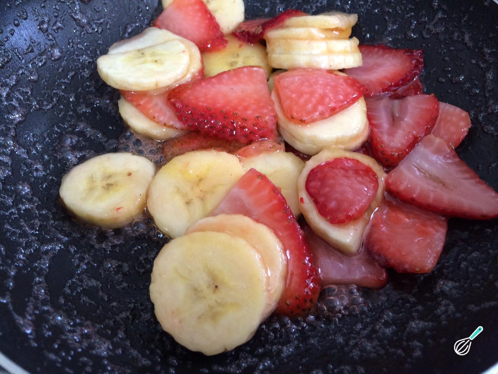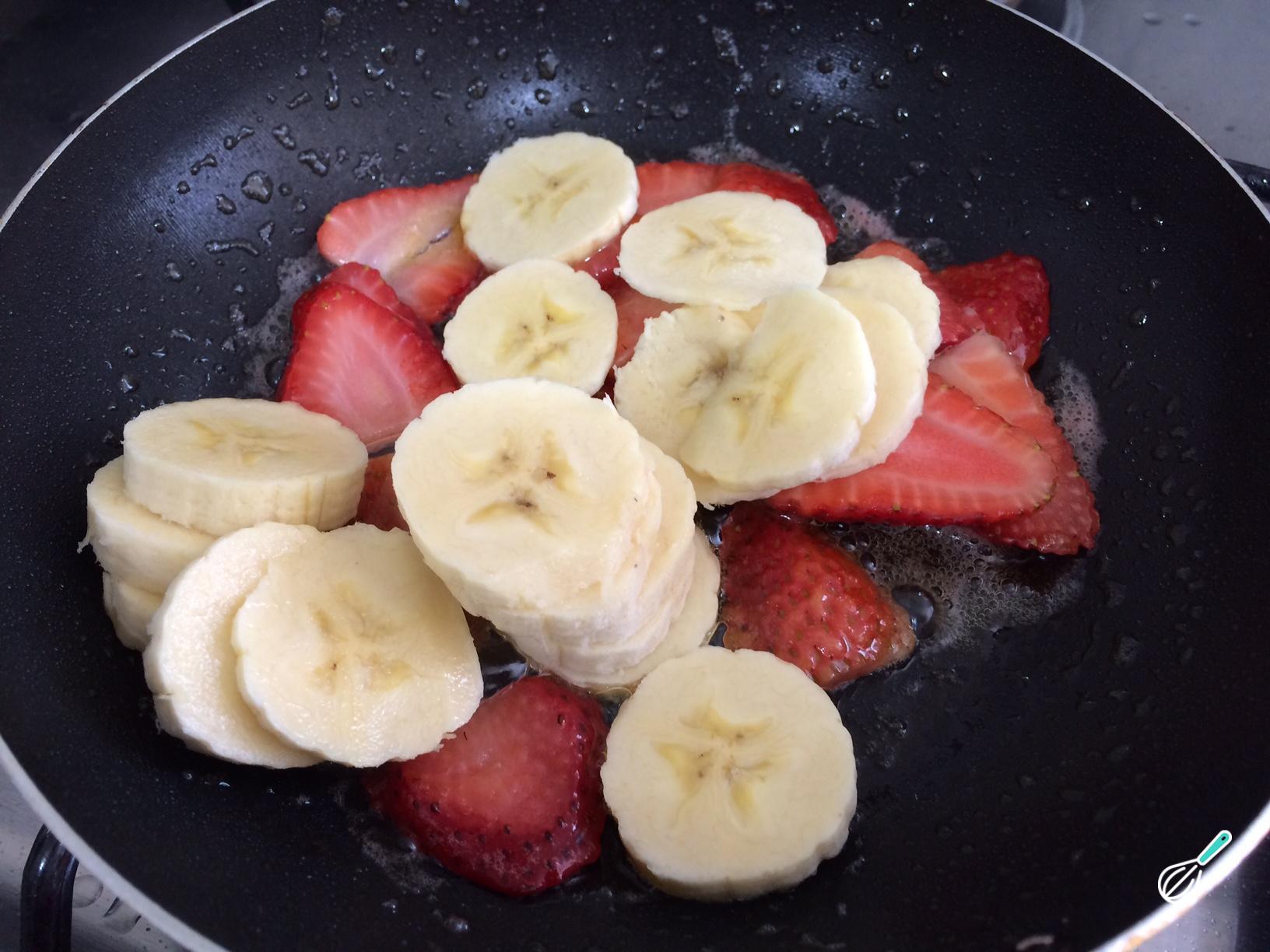 À parte, derreta a manteiga com uma colher de sopa de açúcar em uma frigideira. Quando o açúcar se dissolver, adicione os morangos e bananas cortados em fatias e deixe cozinhar em fogo muito baixo.