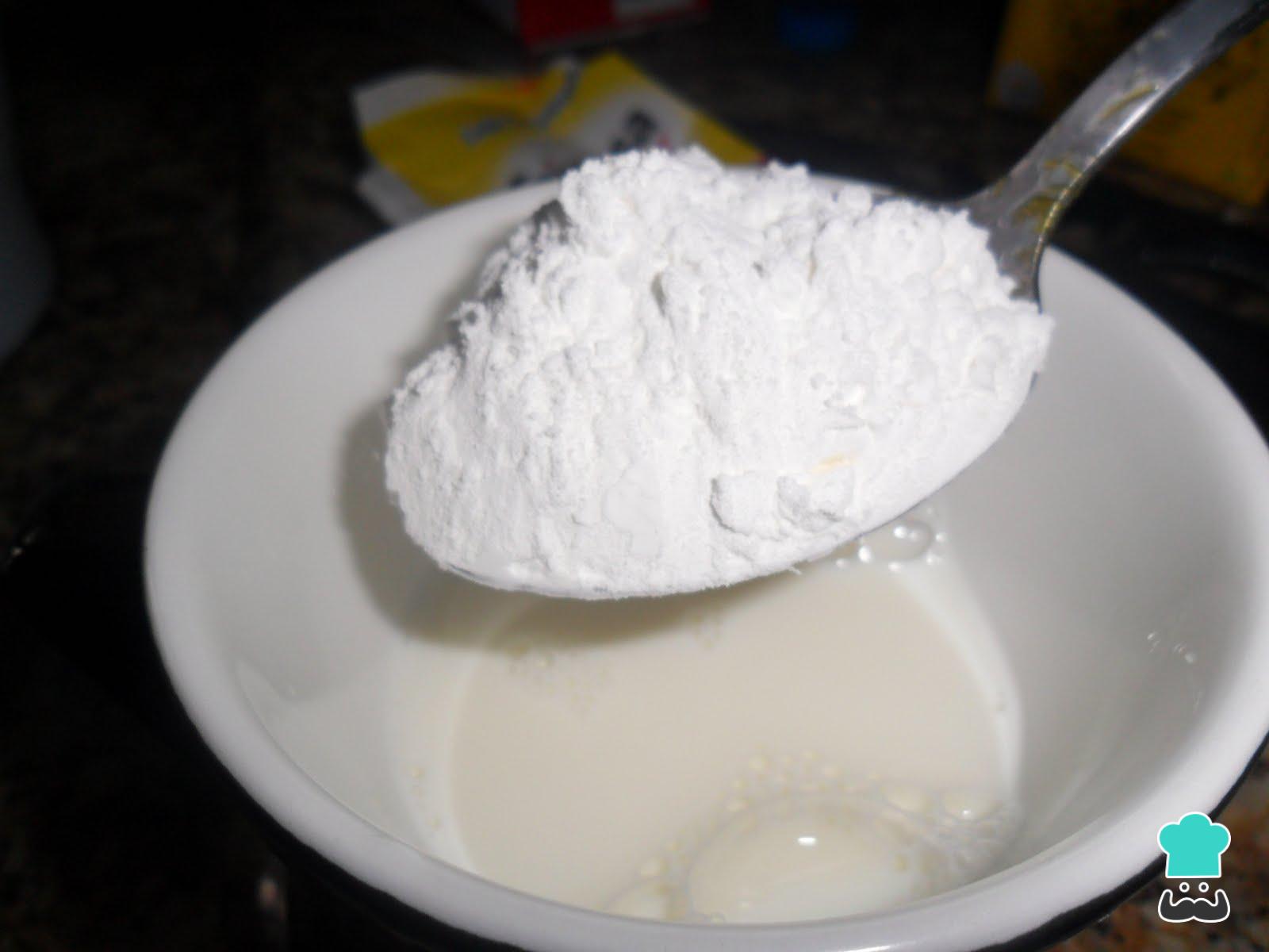 O primeiro passo para preparar o mingau de chocolate é dissolver o amido de milho em um pouco de leite, de preferência usando um batedor de arame.