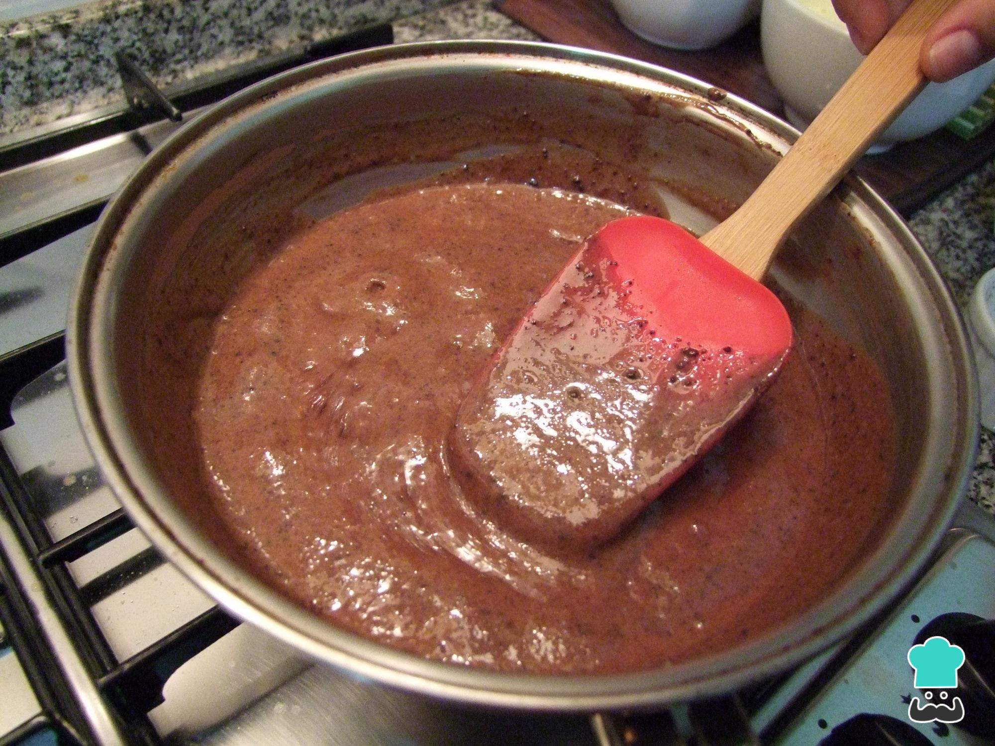 Coloque numa panela o restante leite, o cacau e o açúcar, e misture muito bem estes ingredientes usando novamente um batedor de arame. Adicione o preparado anterior de leite e amido e misture.
