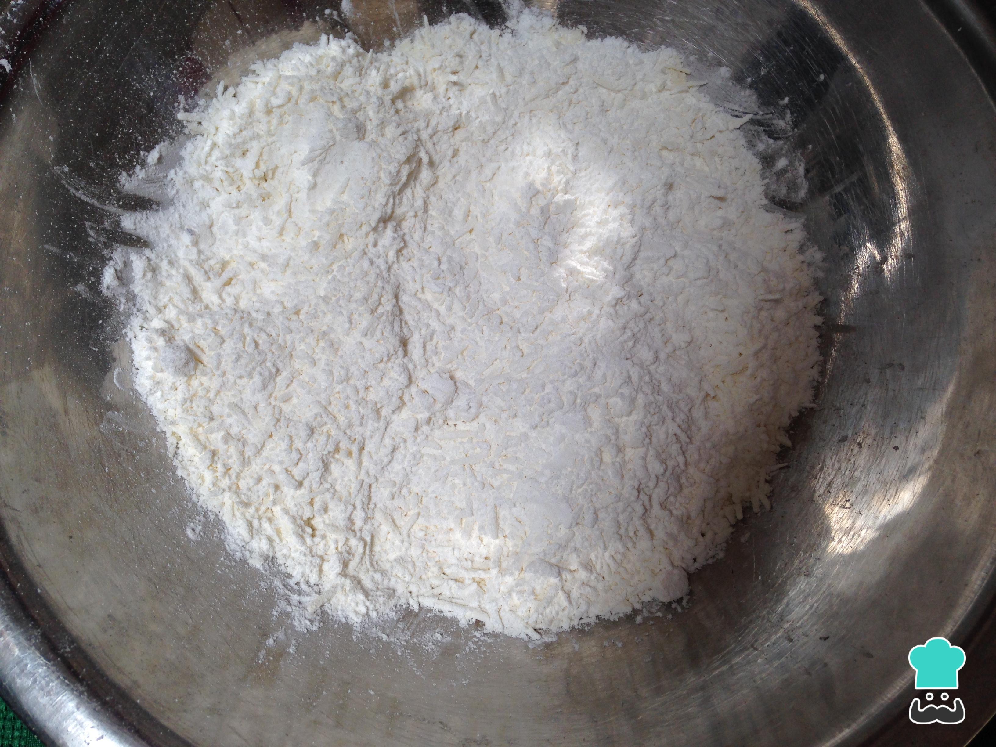 Coloque a farinha e o queijo ralado em uma tigela grande e misture bem com as mãos.