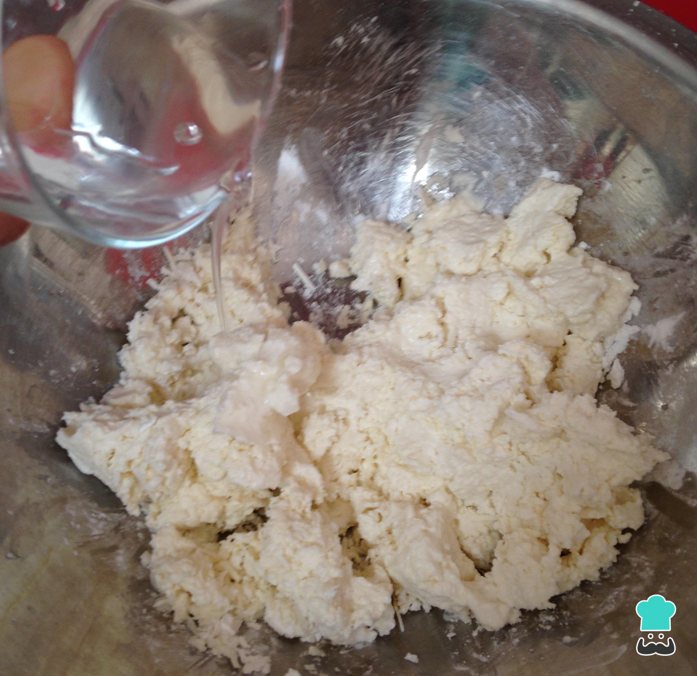 Aos poucos, e enquanto mistura, adicione a água. Continue amassando até obter uma massa homogênea e ligeiramente grudenta - se a massa ficar muito mole, adicione mais um pouco de farinha.
