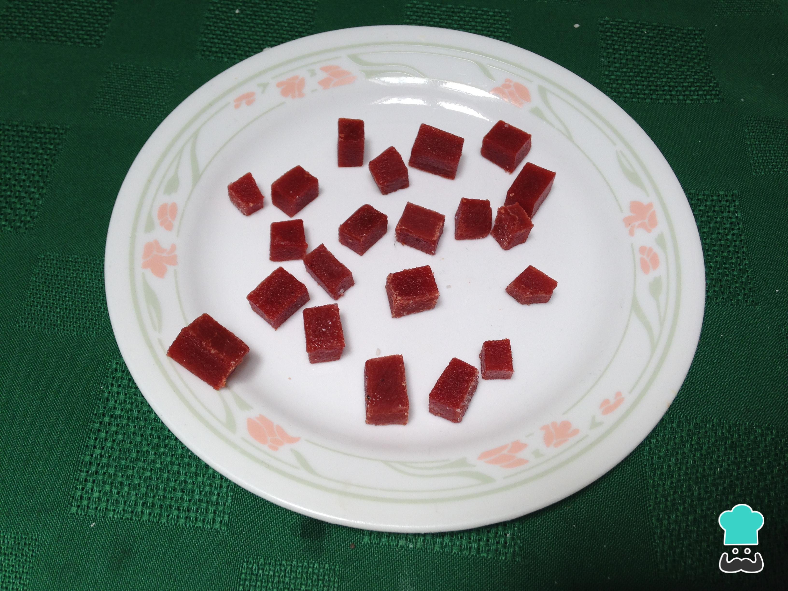De seguida corte a goiabada em cubinhos com tamanhos iguais.