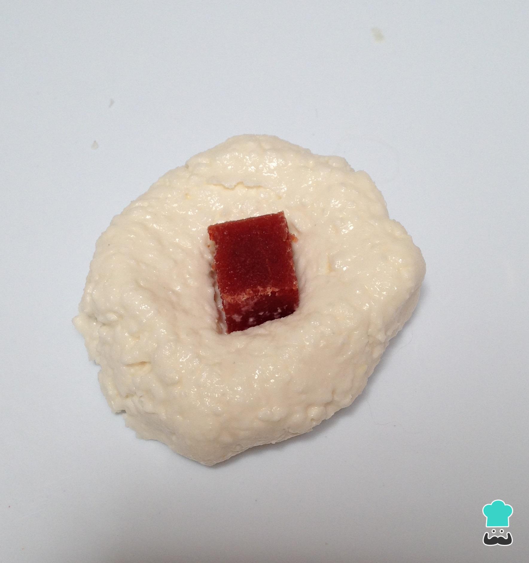 Abra um pouco da massa dos sonhos na palma da sua mão, coloque ao centro um pedaço de goiabada e feche em forma de bolinha.