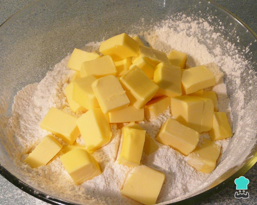 Comece por preparar a massa das tortinhas: em uma tigela coloque a farinha e a manteiga cortada em cubos, e misture com as pontas dos dedos, até virar uma farofa.