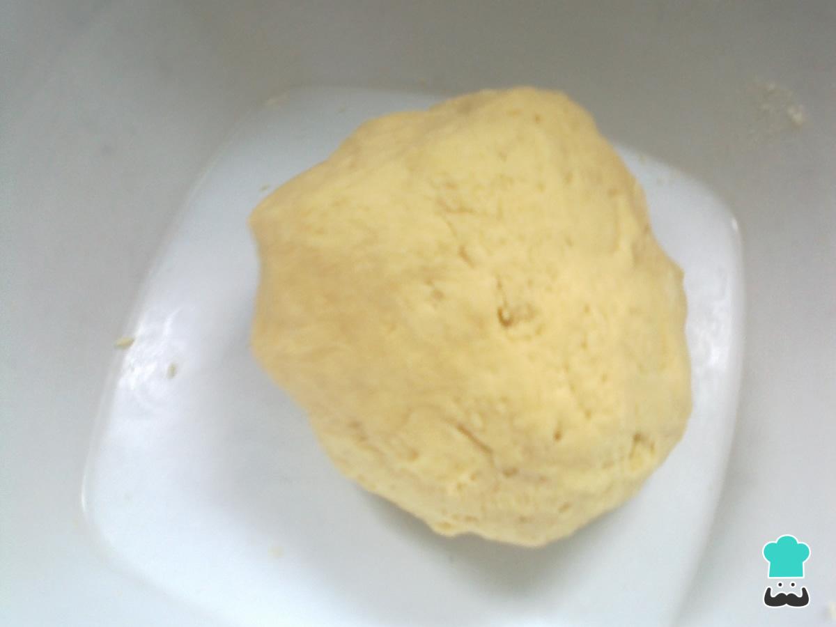 Em seguida, adicione o sal, o açúcar, o ovo batido e misture tudo. Quando começar a virar uma massa espessa, junte água fria e continue amassando, até ficar compacta e homogênea, como na fotografia.