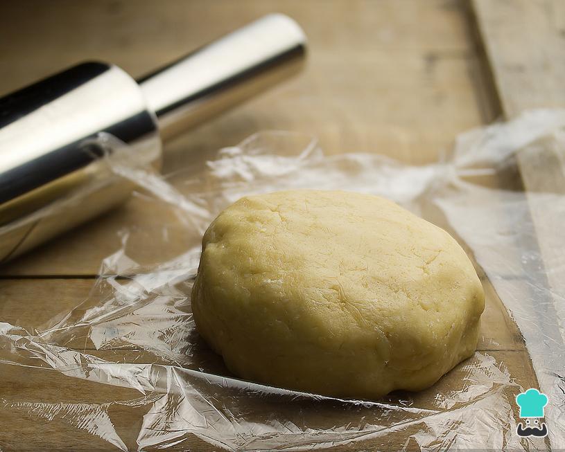 Após o passo anterior, modele a massa das mini tortas doces com frutas em forma de bola, e embrulhe em plástico filme. Reserve na geladeira por 30 minutos, assim será mais fácil trabalhá-la.