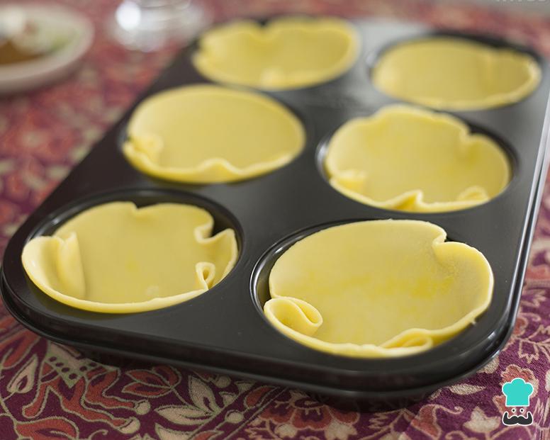 Após o tempo de repouso da massa, retire-a da geladeira e abra com um rolo. Corte pequenos círculos, que corresponderão à base das tortinhas, e coloque em forminhas de cupcake untadas. Leve a assar no forno por 15 minutos, ou até a massa ficar dourada.