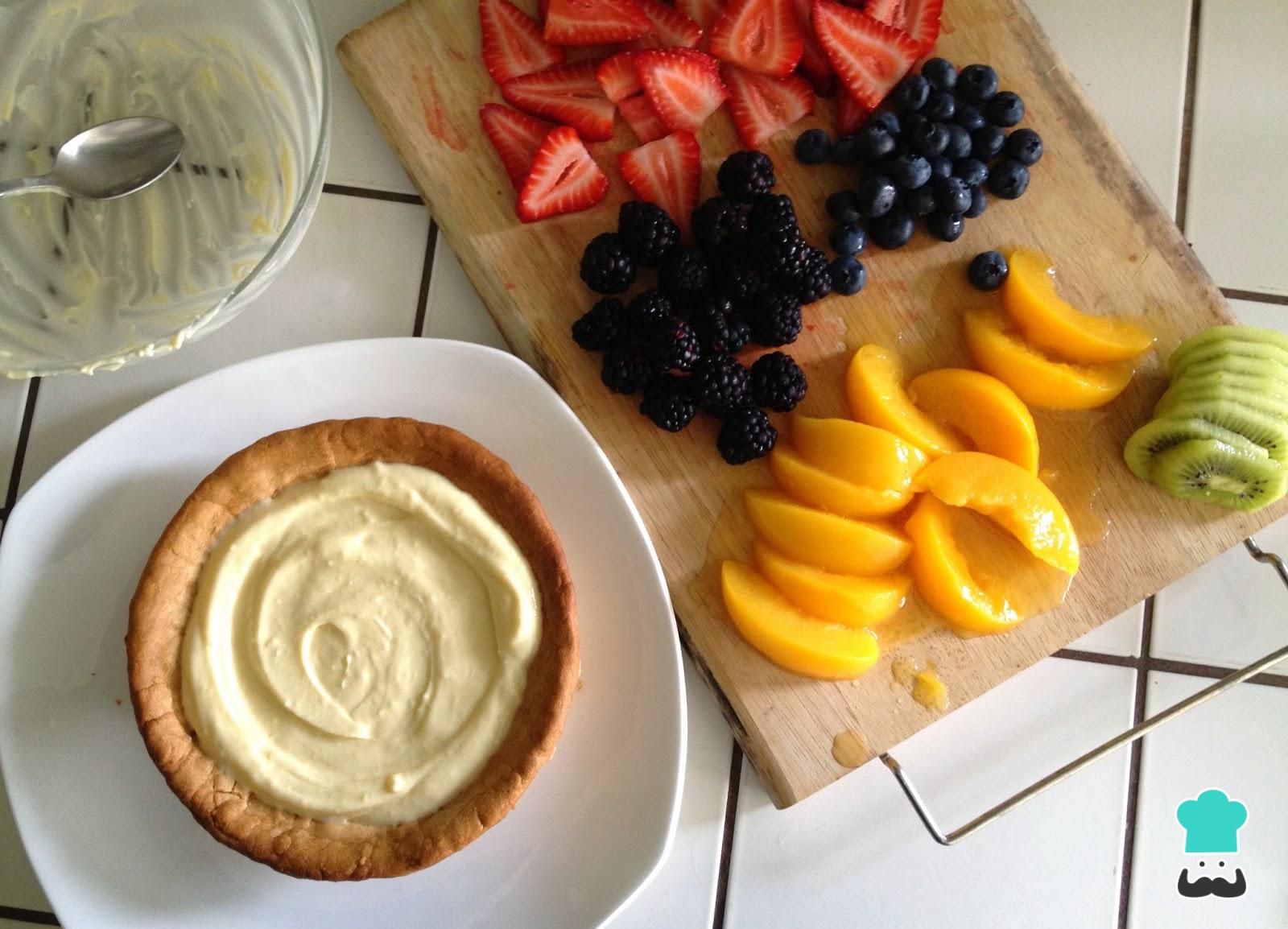 Para montar as tortinhas, lave e corte as frutas frescas em pedaços ou fatias. Retire as bases de massa do forno, distribua o creme de confeiteiro por cada uma, e decore a gosto com as frutas escolhidas.