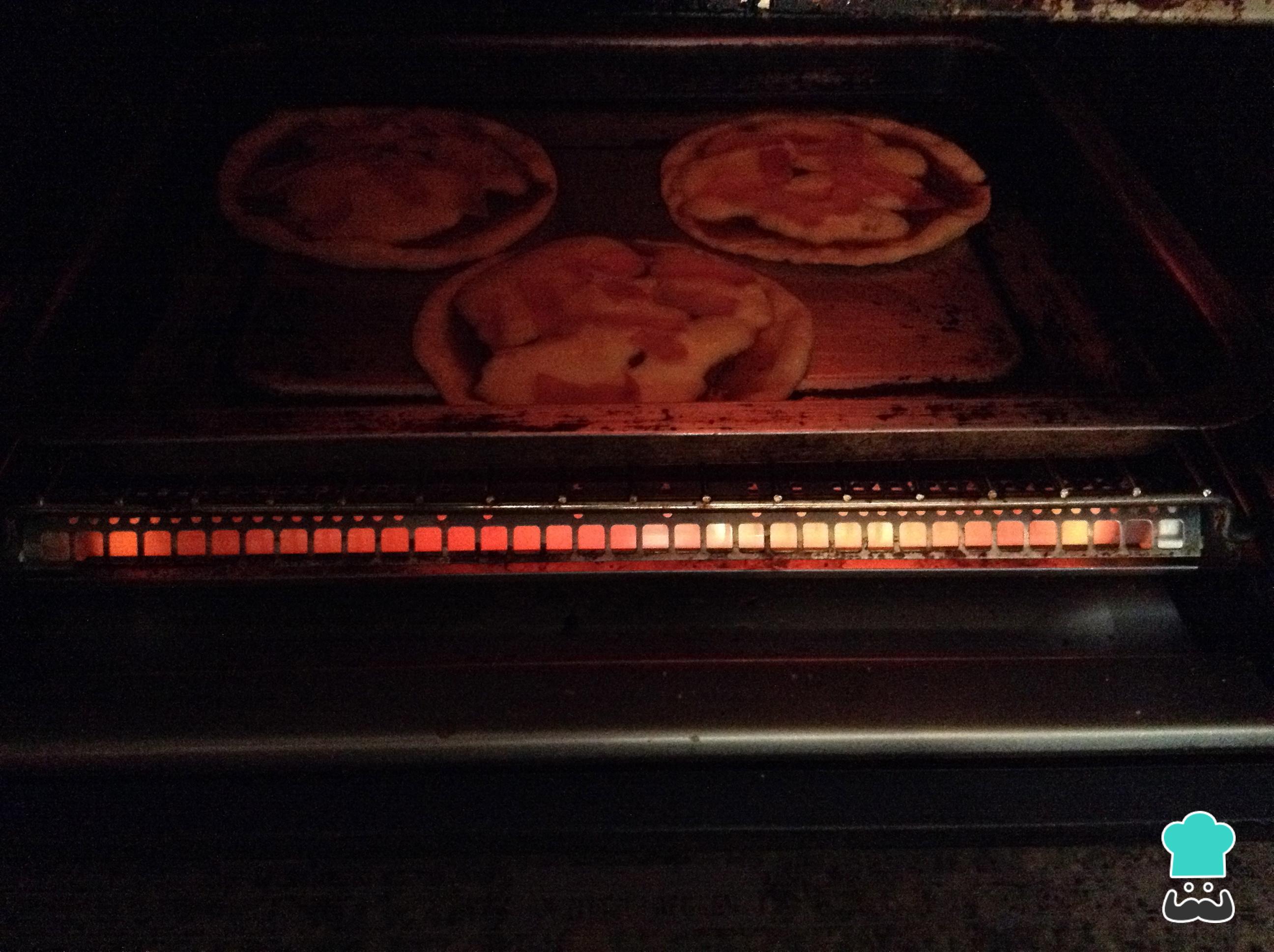 Leve suas minipizza de queijo e presunto a assar durante 10 a 15 minutos no forno pré-aquecido a 180ºC, até que o queijo derreta.
