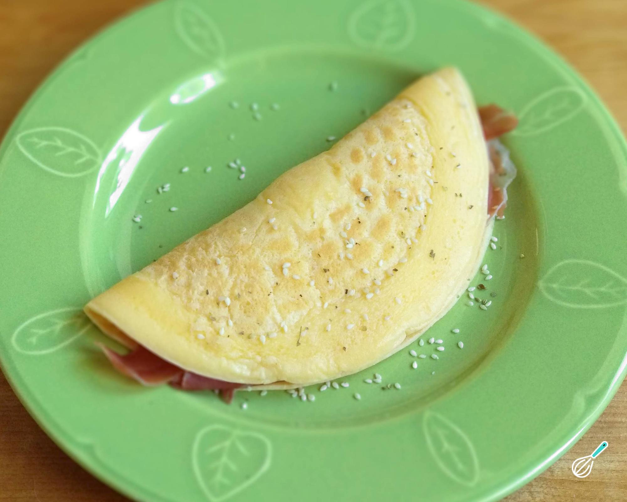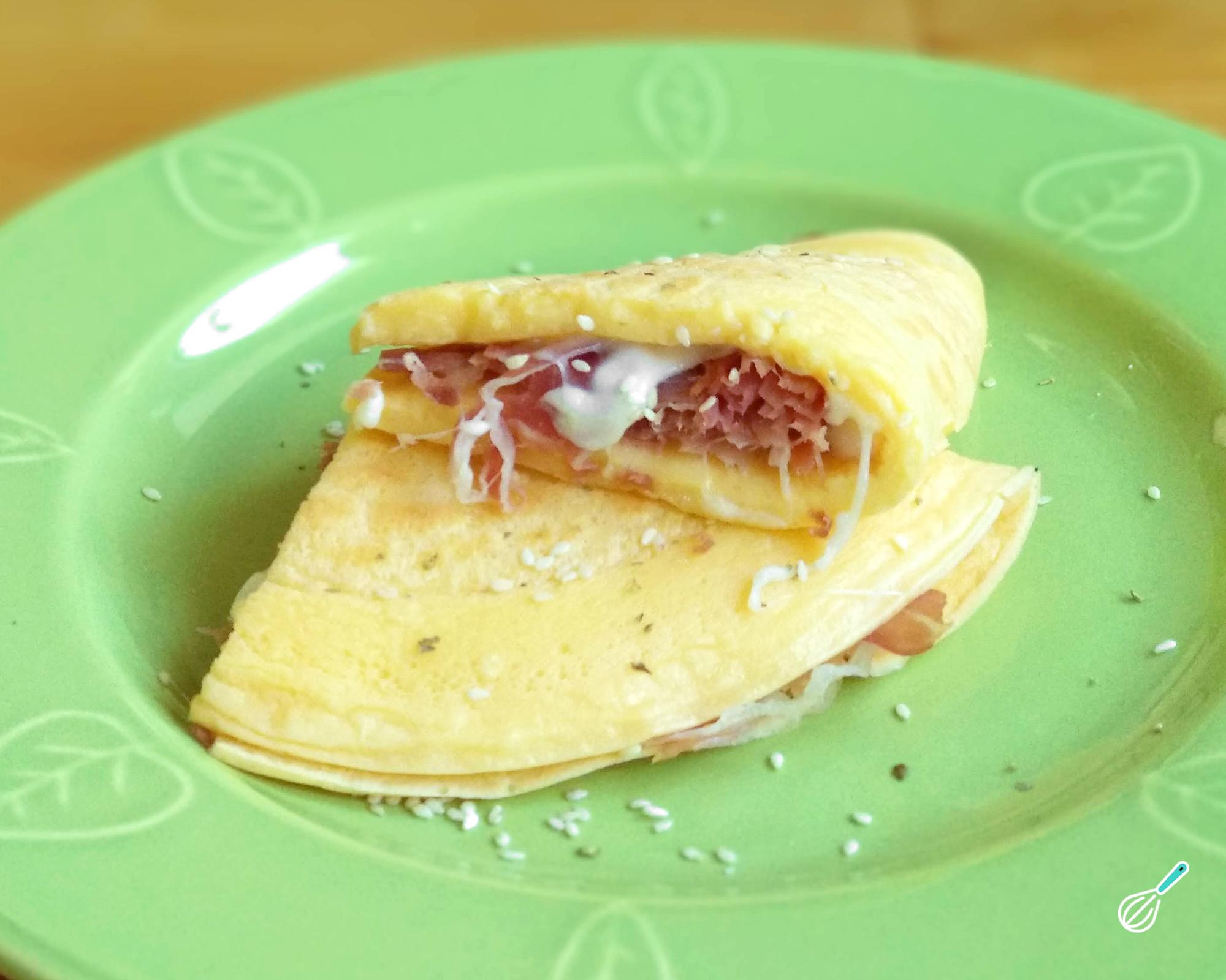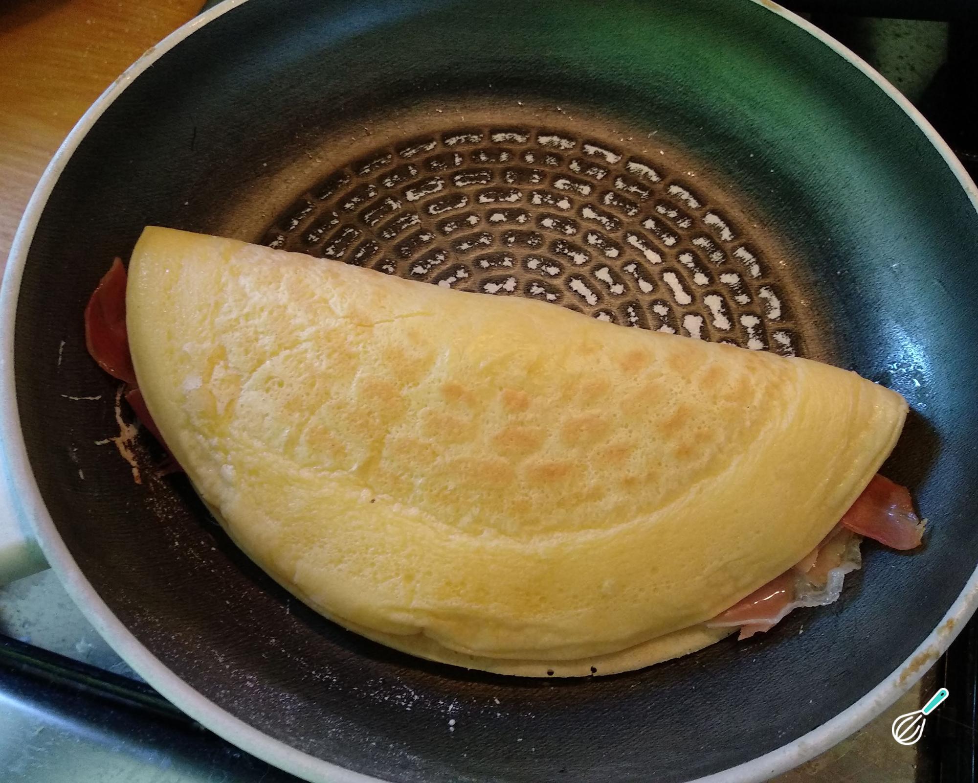 Acrescente o queijo e o presunto e espere o queijo derreter um pouco. Dobre ao meio e está pronto!
