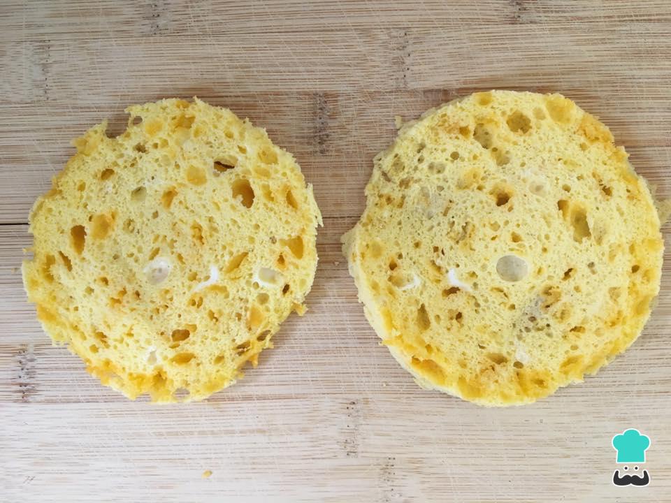 Unte um recipiente de vidro de aproximadamente 15 cm e coloque aí a misturinha. Leve ao microondas em potência máxima por uns 3 minutos e o resultado será um "pão" esponjoso. Corte ao meio como na fotografia.