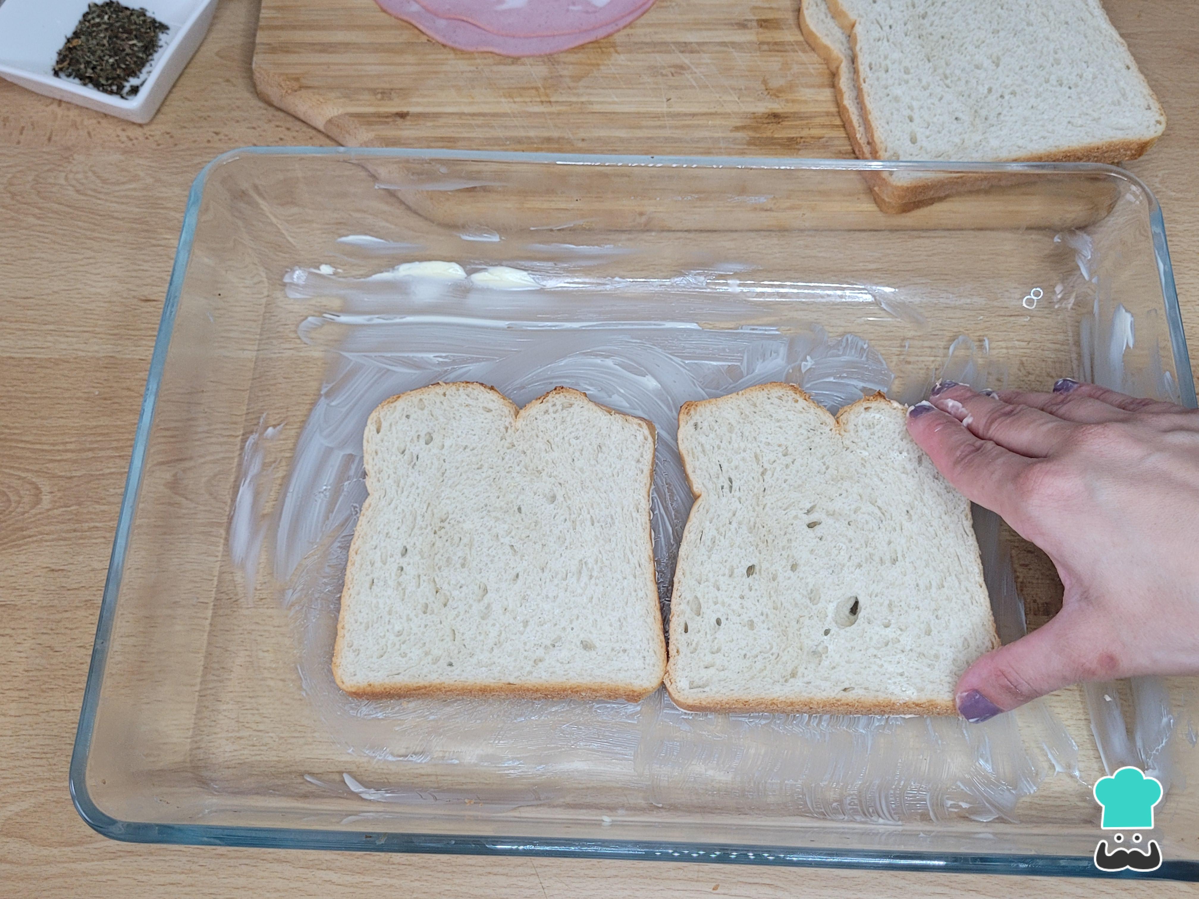 Unte uma forma que possa ir ao micro-ondas onde caibam as fatias de pão lado a lado ou faça em etapas.