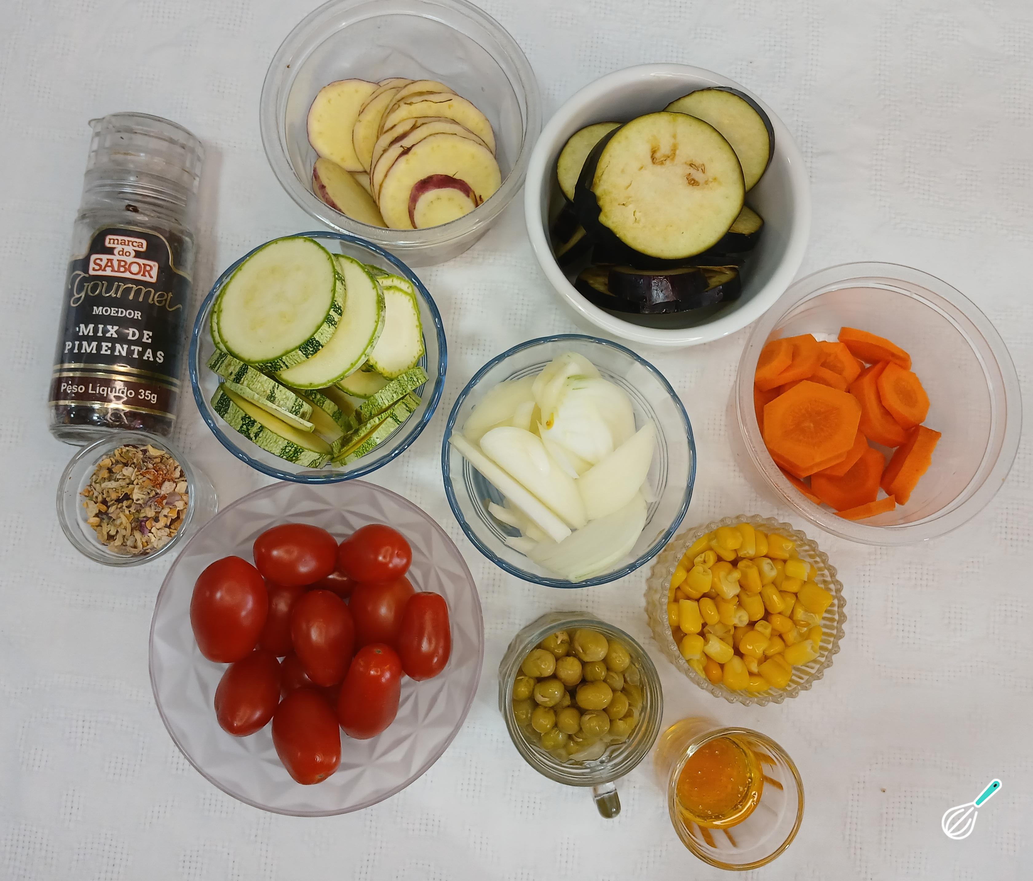 Dica: Deixe os legumes separados e cortados, assim facilita o preparo da receita. O critério do corte dos legumes é da preferência de cada um.