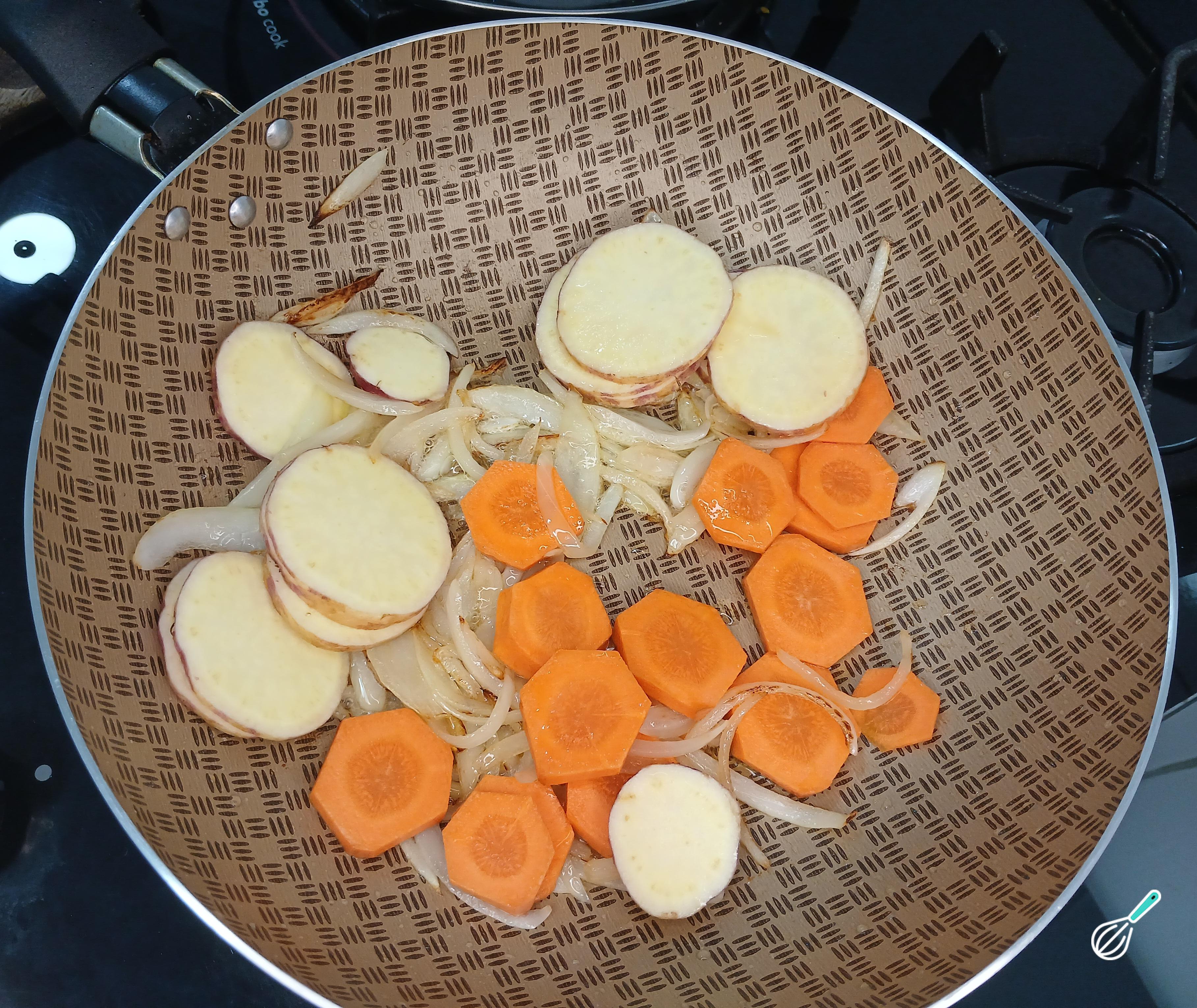 Depois de dourar a cebola, adicione a batata doce cortada e a cenoura. Deixe que elas refoguem um pouco e para cozinha-las vá acrescentando água em pequenas quantidades. Praticamente pingando. Tampe a panela e deixe que cozinhe com a água dos próprios legumes. Mantenha sempre o fogo baixo.