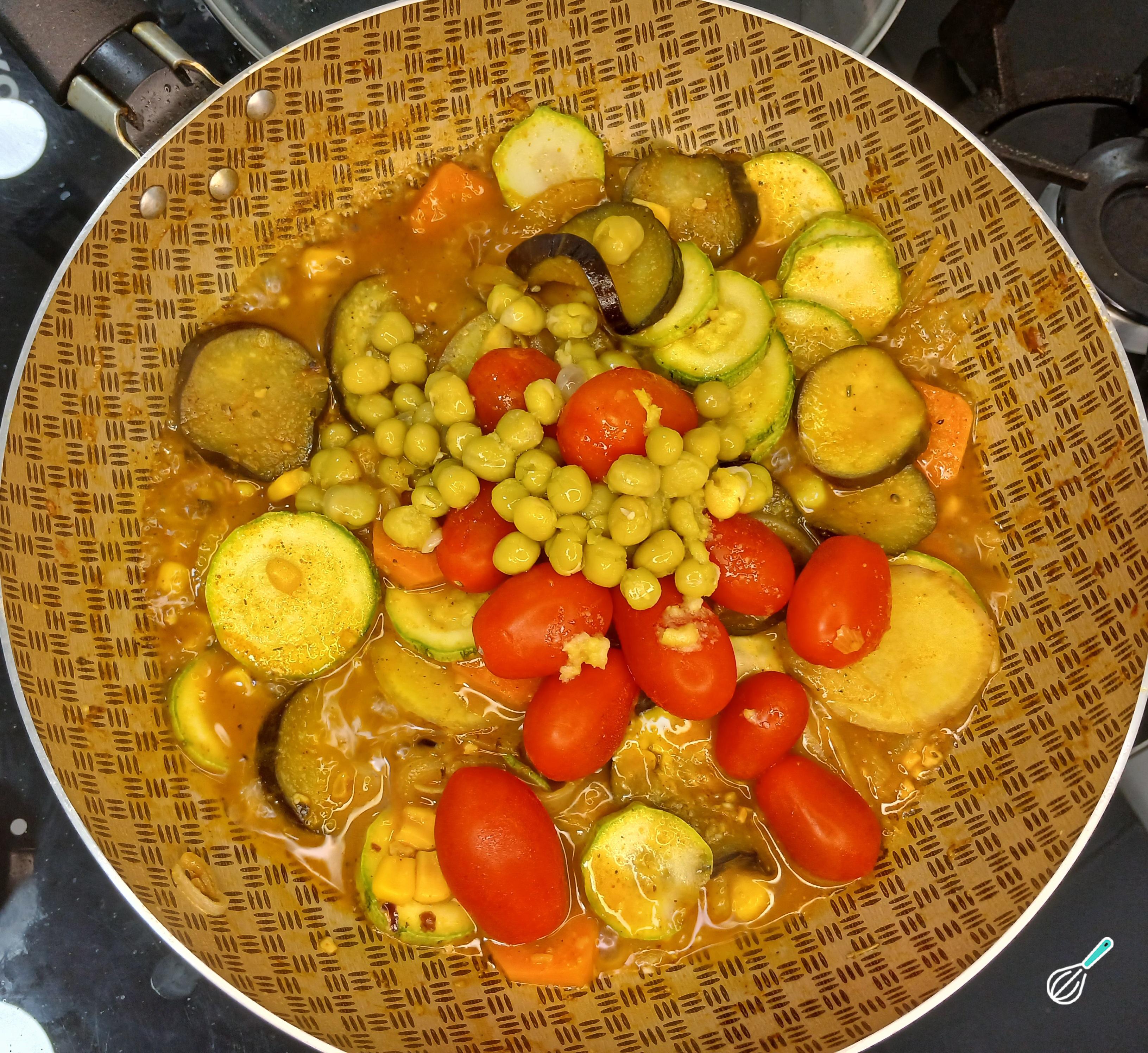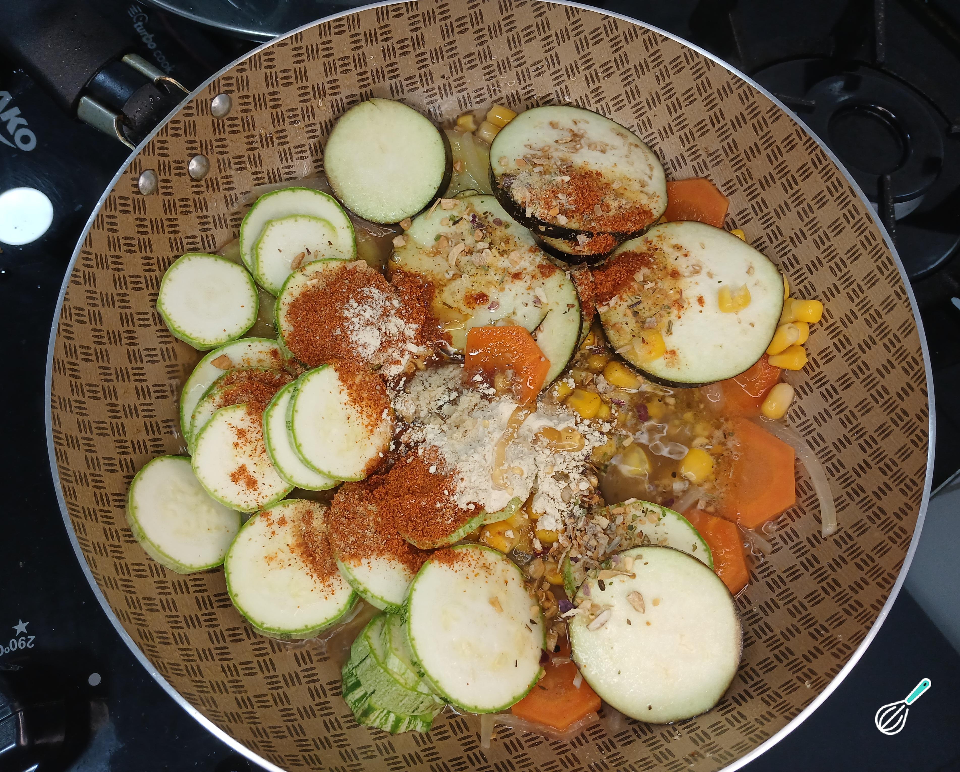 Depois da cenoura e batata doce cozidas, acrescente a abobrinha verde, a berinjela, o milho verde e o mel. Mexa e nessa etapa acrescente os temperos, sal e pimenta. Misture bem para incorporar o sabor e vá novamente pingando mais água. Não esqueça de tampar a panela. Verifique o cozimento.