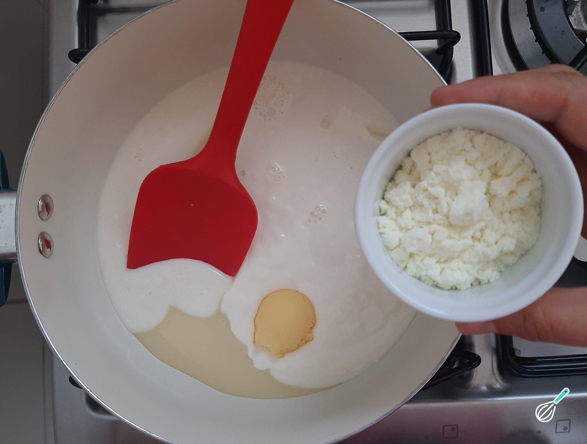 Em seguida, junte os demais ingredientes: manteiga, leite integral, creme de leite e leite em pó.