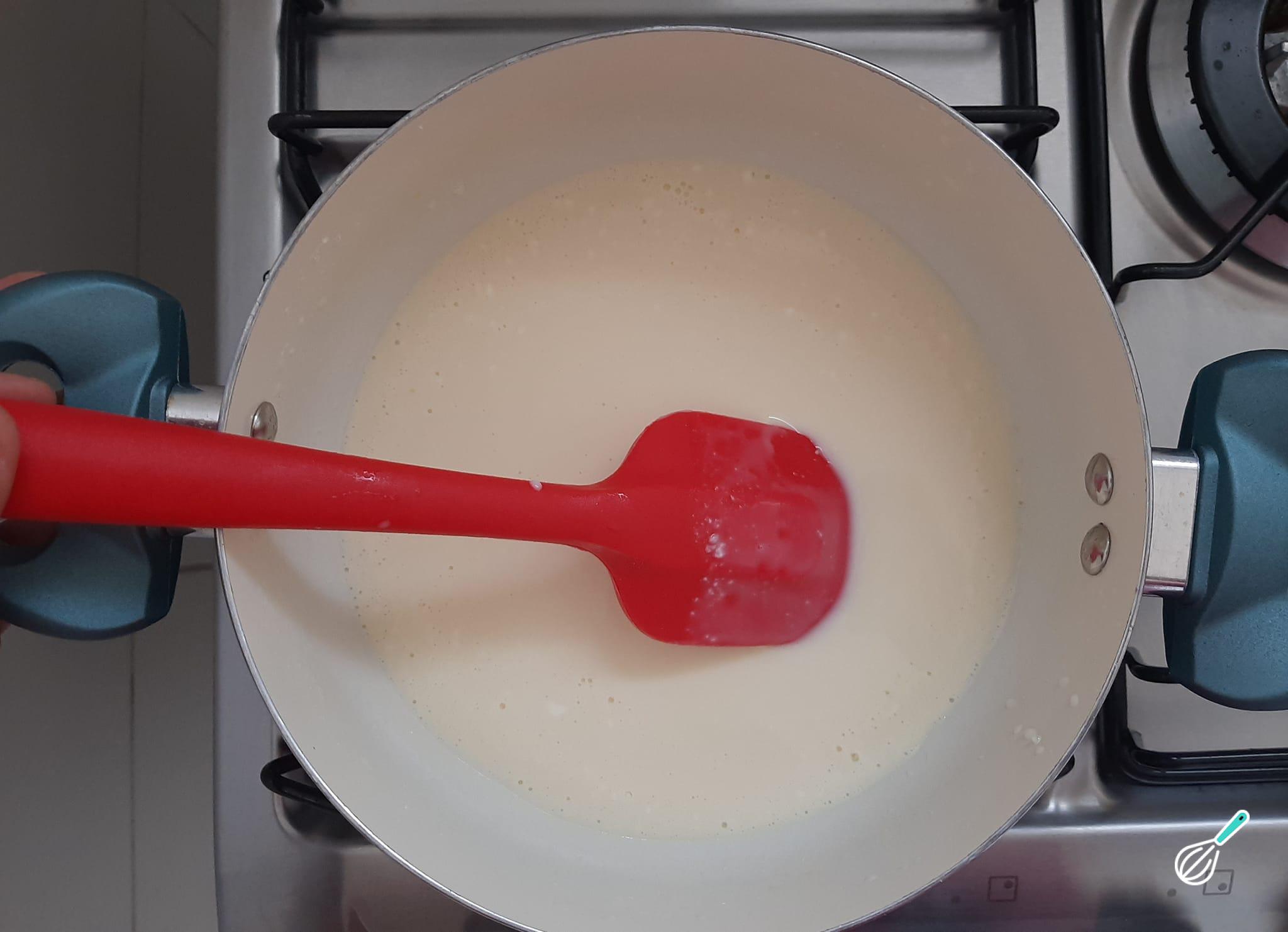 Ligue o fogo baixo e deixe cozinhar, sempre mexendo (de preferência com uma espátula larga e firme de silicone), até que comece a engrossar o creme.