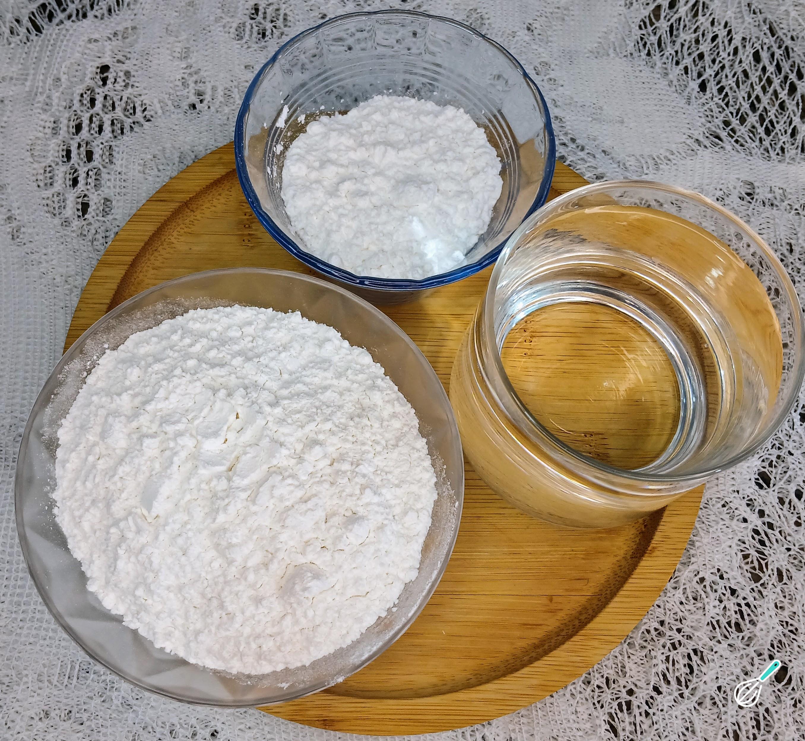 Comece separando os ingredientes para o preparo do mochi. Separe a farinha de arroz glutinoso, o açúcar impalpável, a água e um pouco de amido. Deixe tudo separado.