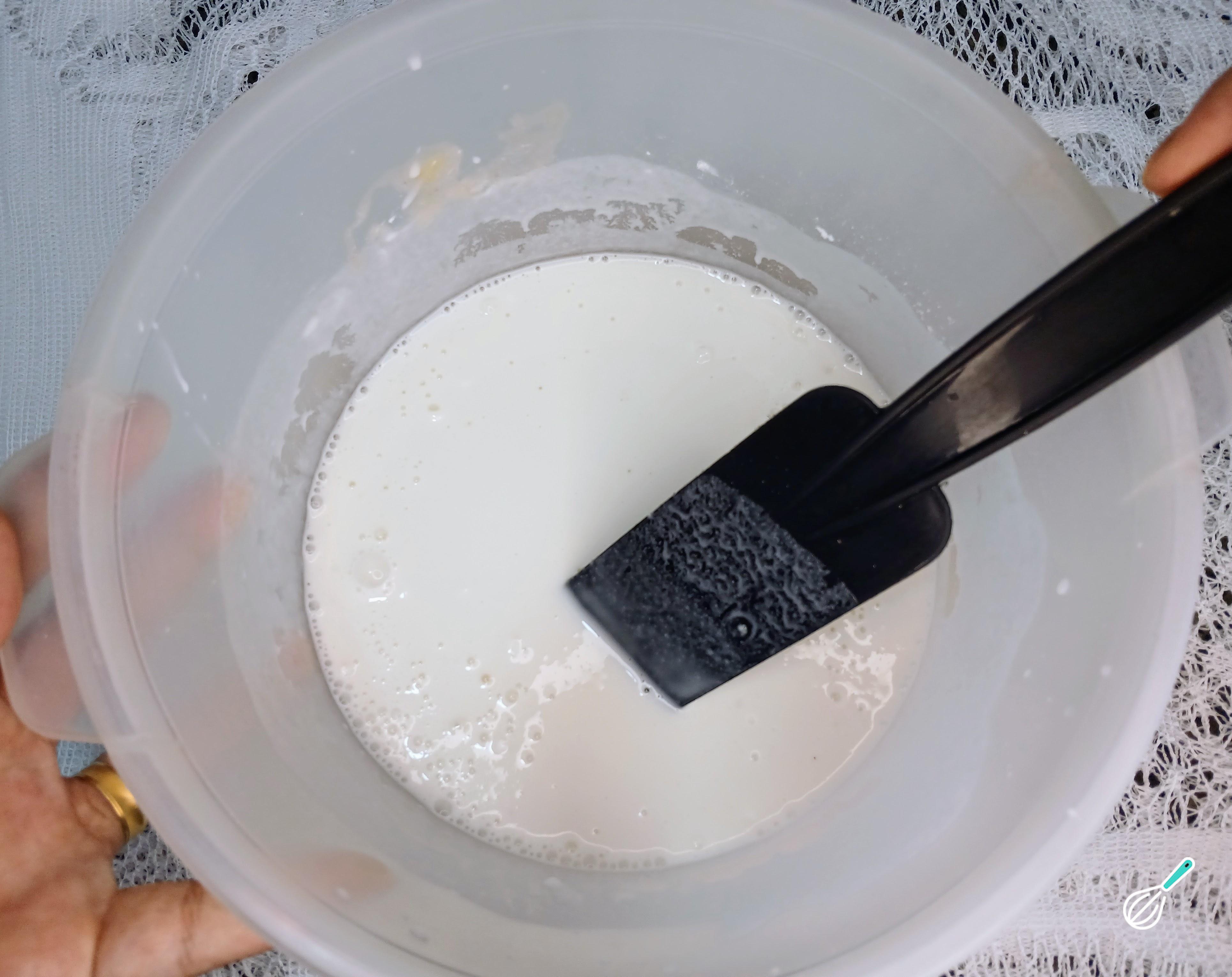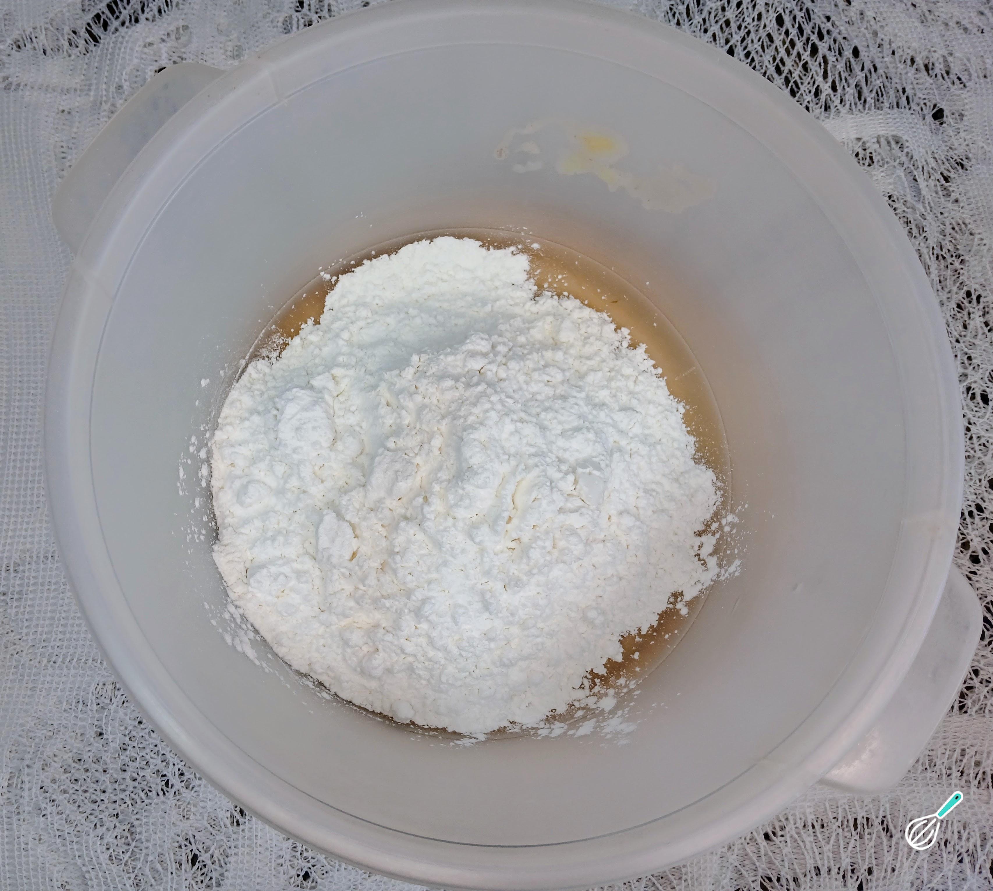 Feito isso, em uma panela para micro-ondas, coloque a farinha de arroz glutinoso e o açúcar impalpável, misture bem.