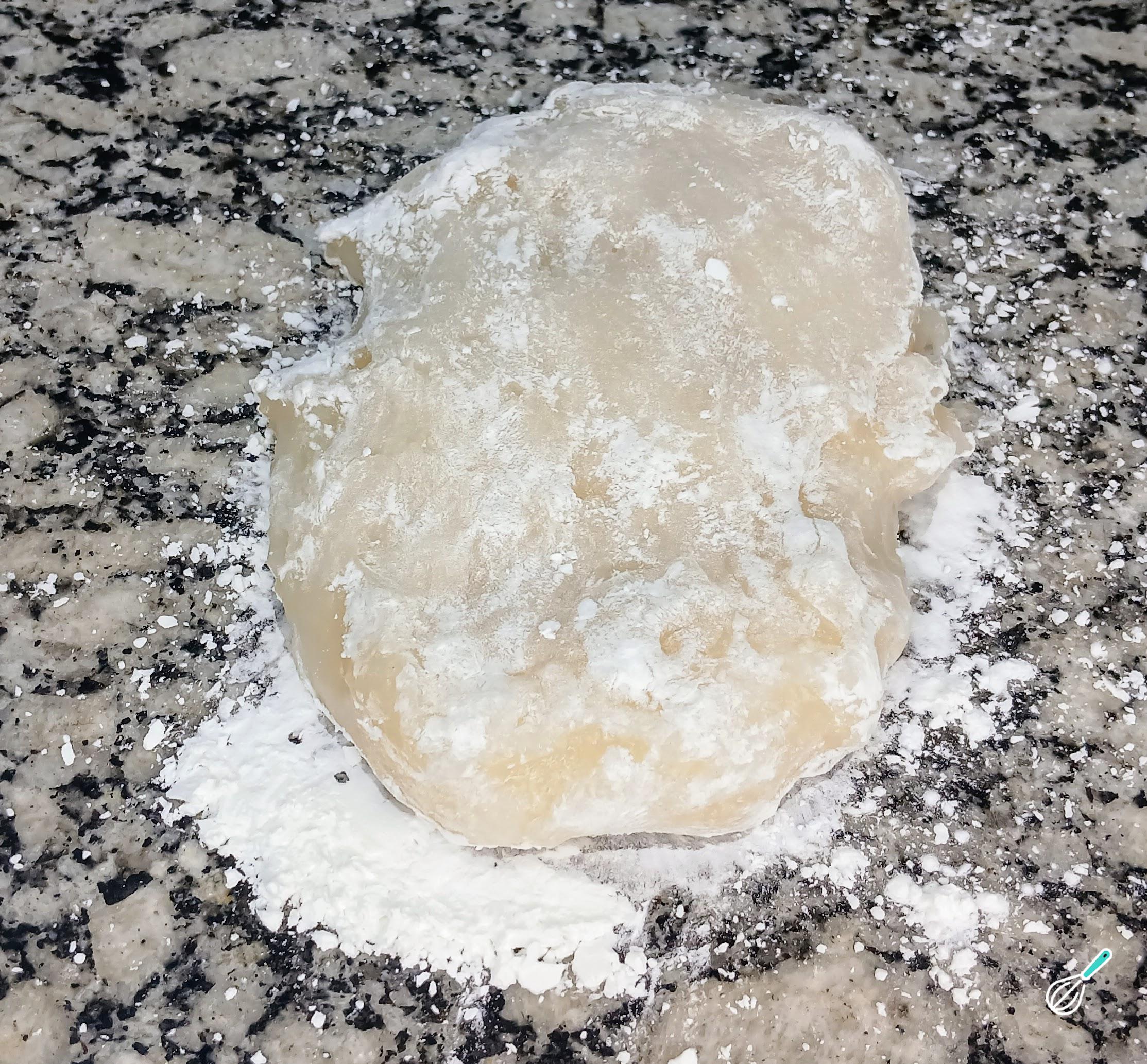 Assim que massa estiver pronta, retire da panela e coloque sobre uma bancada salpicada com amido de milho. Deixe descansar ali e esfriar.