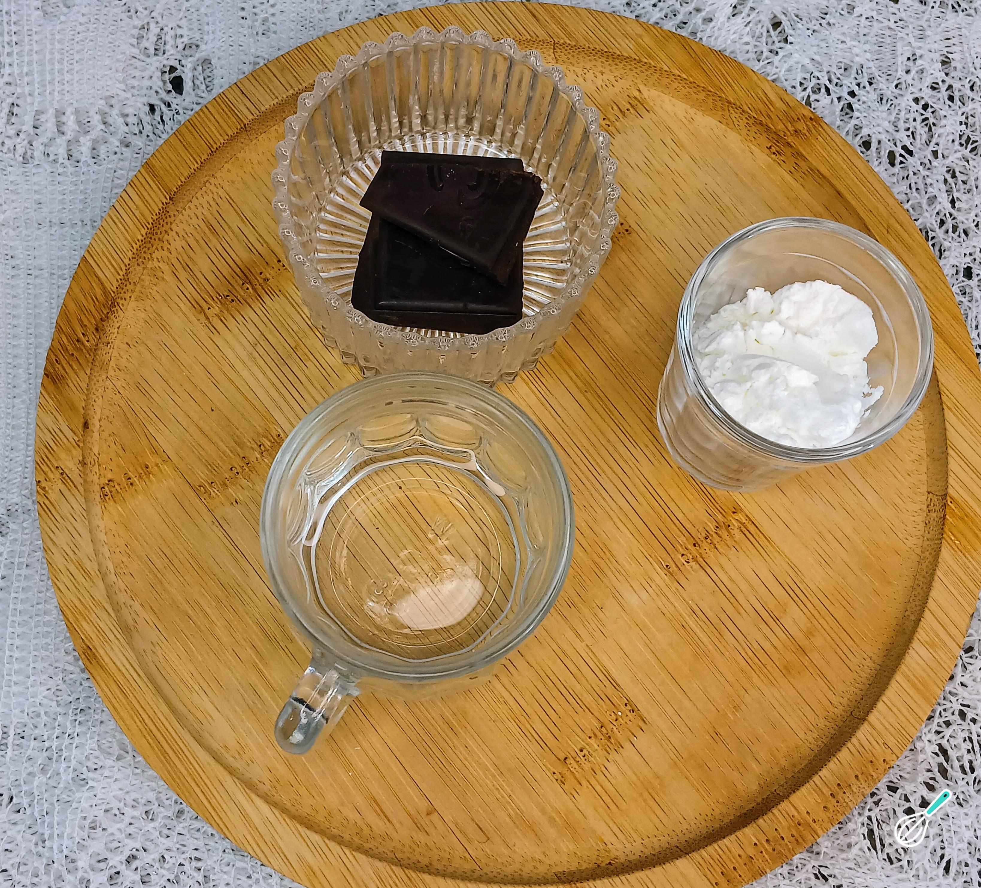 Separe os ingredientes para o recheio. Separe o chocolate meio amargo, o leite em pó, o amido, o açúcar e água. Deixe tudo medido e separado.
