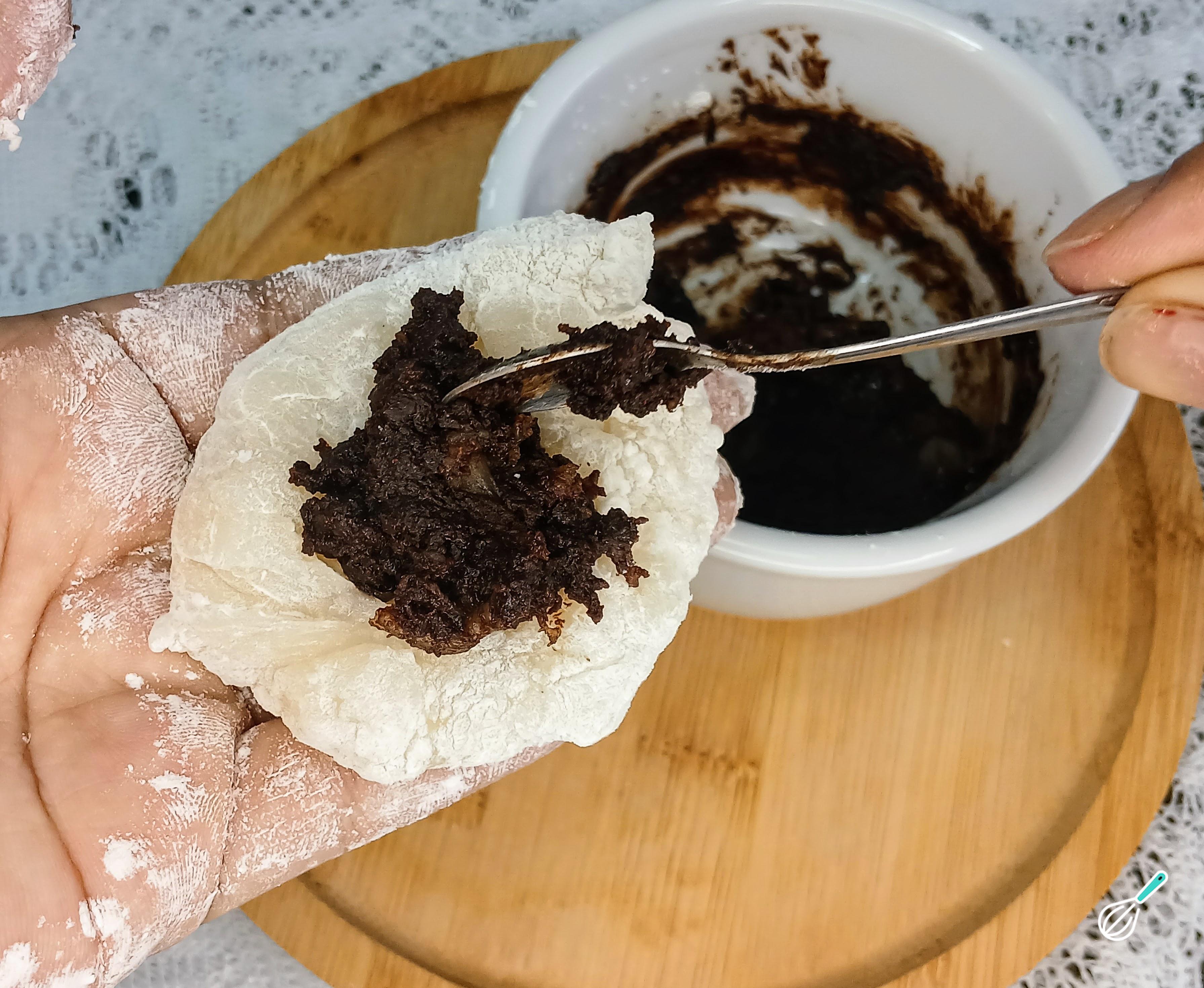 Faça bolinhas, abra a massa do mochi e coloque o recheio de chocolate. Feche e passe o mochi em pouco de amido de milho. Leve para gelar por algumas horas.