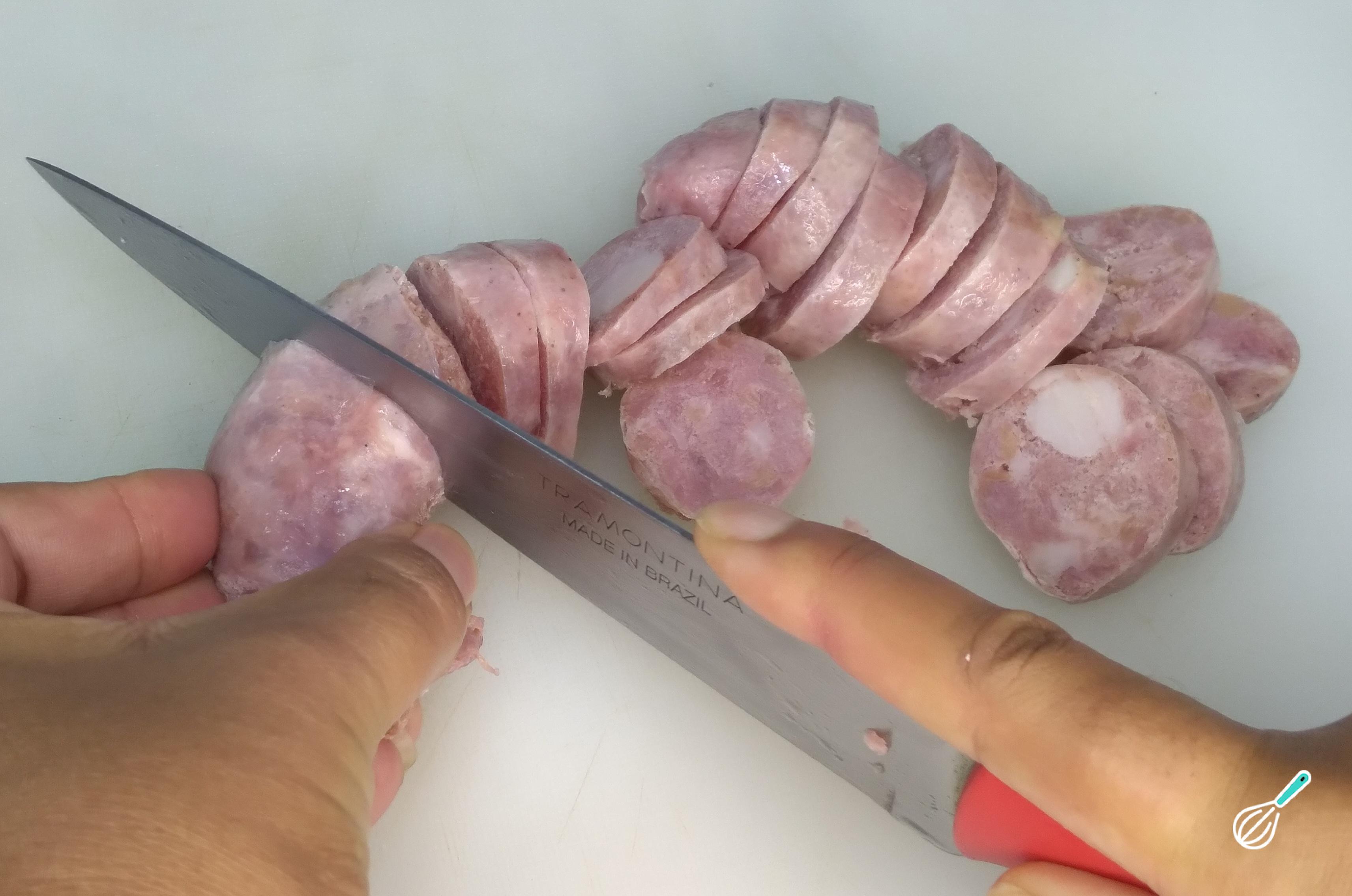 Corte a linguiça toscana em rodelas. Assim o sabor da linguiça ficará mais presente no preparo.