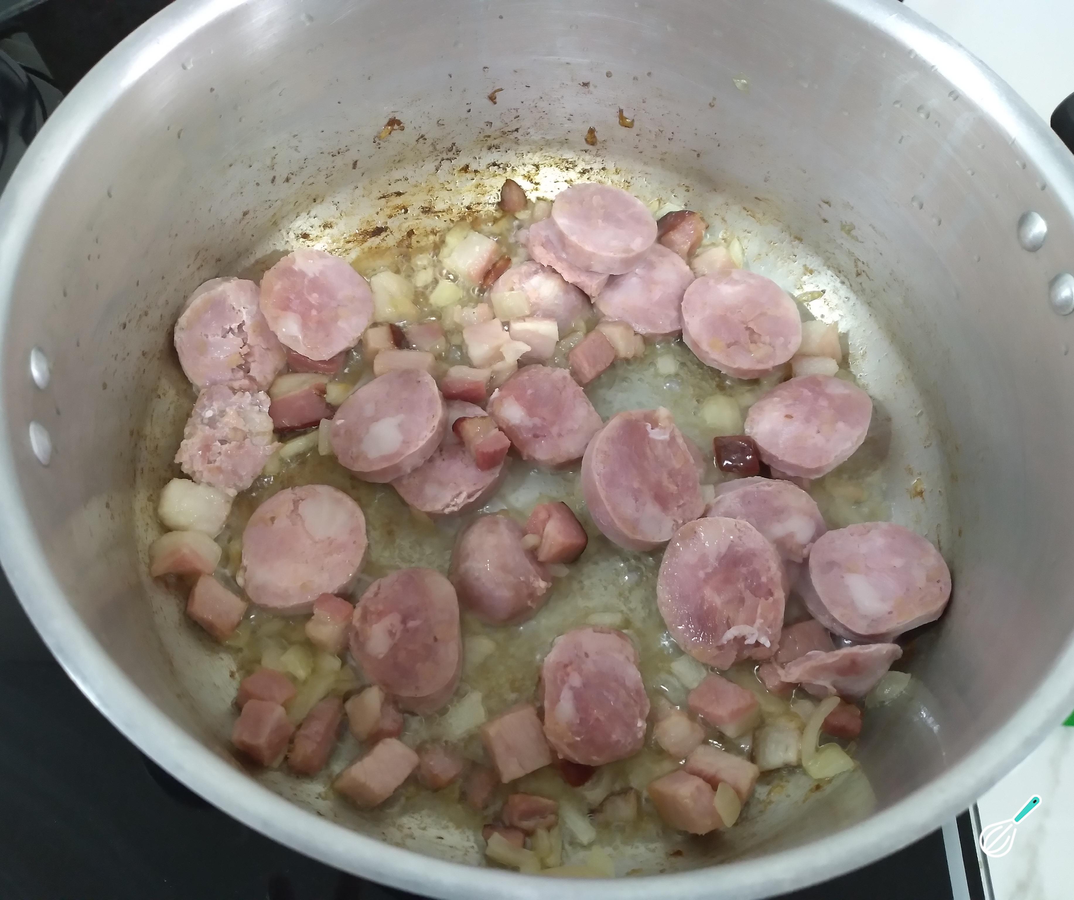 Em uma panela grande coloque óleo de soja, a cebola branca picada e o bacon. Deixe fritar e mexa para a cebola soltar líquidos. Depois que o bacon estiver frito, acrescente a linguiça toscana e deixe fritar. Mexa bem para incorporar os sabores.