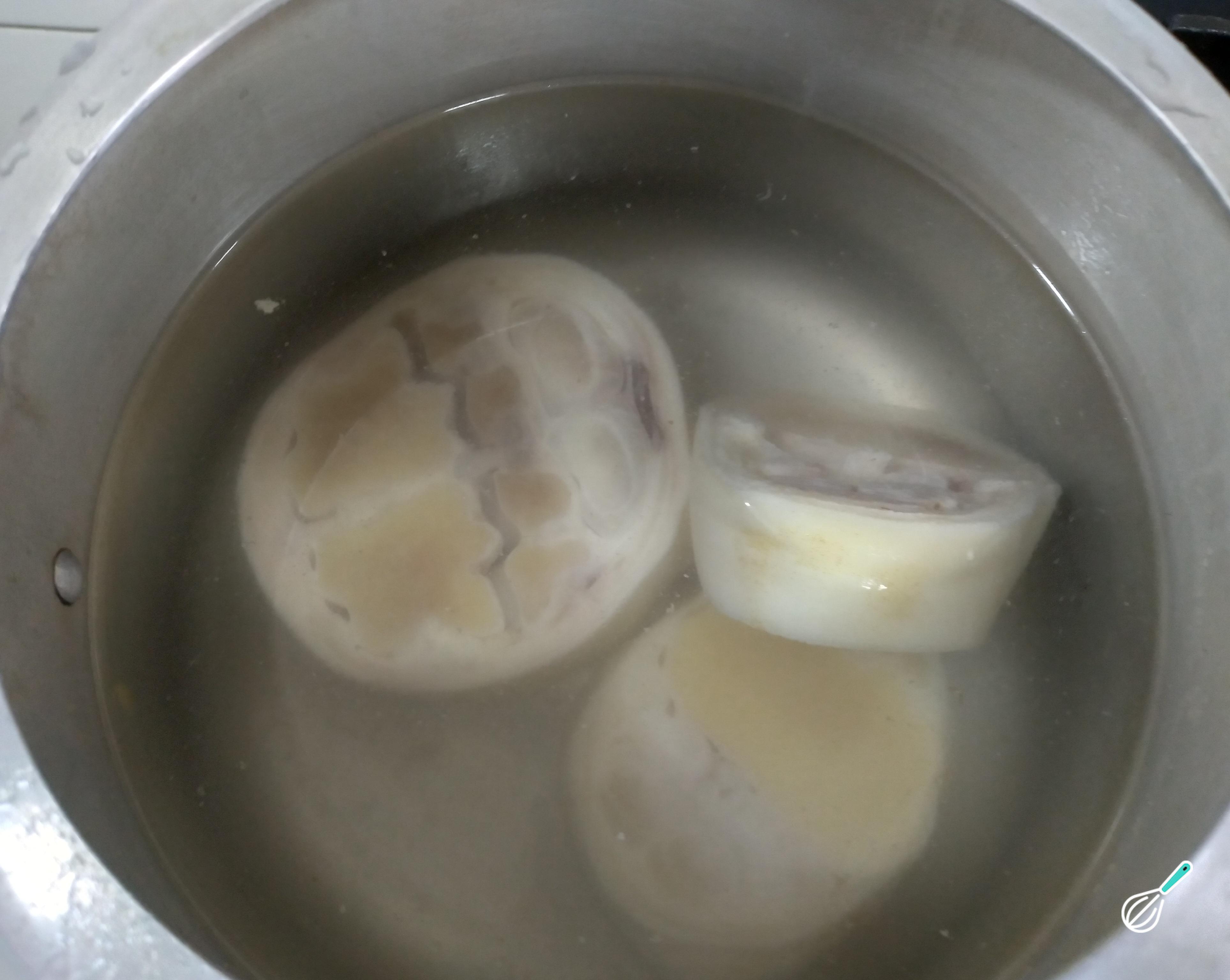 Dica: Prefira a cebola branca para esse preparo. Lave bem a pata bovina e o bucho.