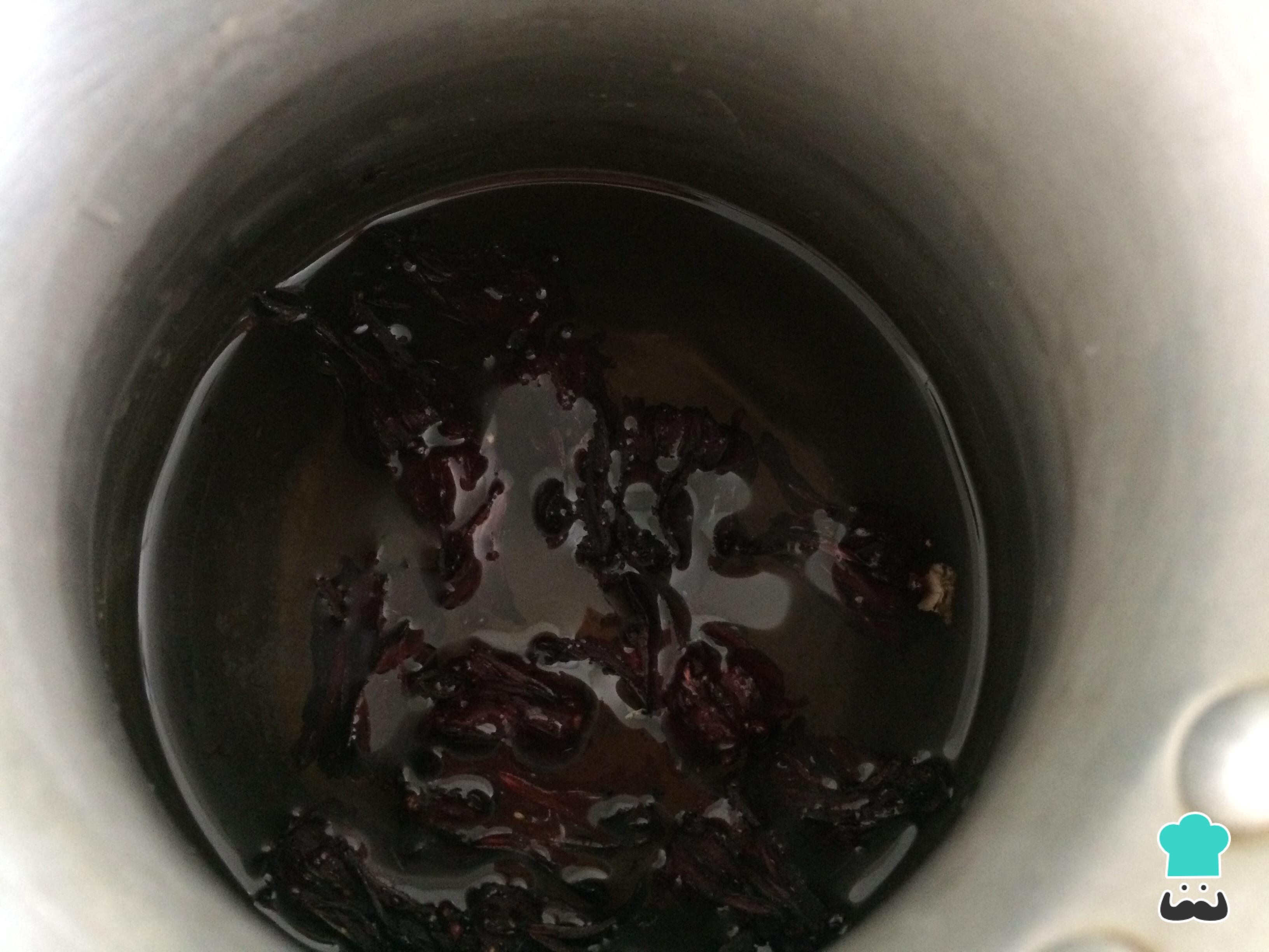 Em uma panela com um copo de água, ferva o hibisco por 10 minutos, como se fosse para fazer chá. Depois passe por uma peneira e reserve até esfriar.