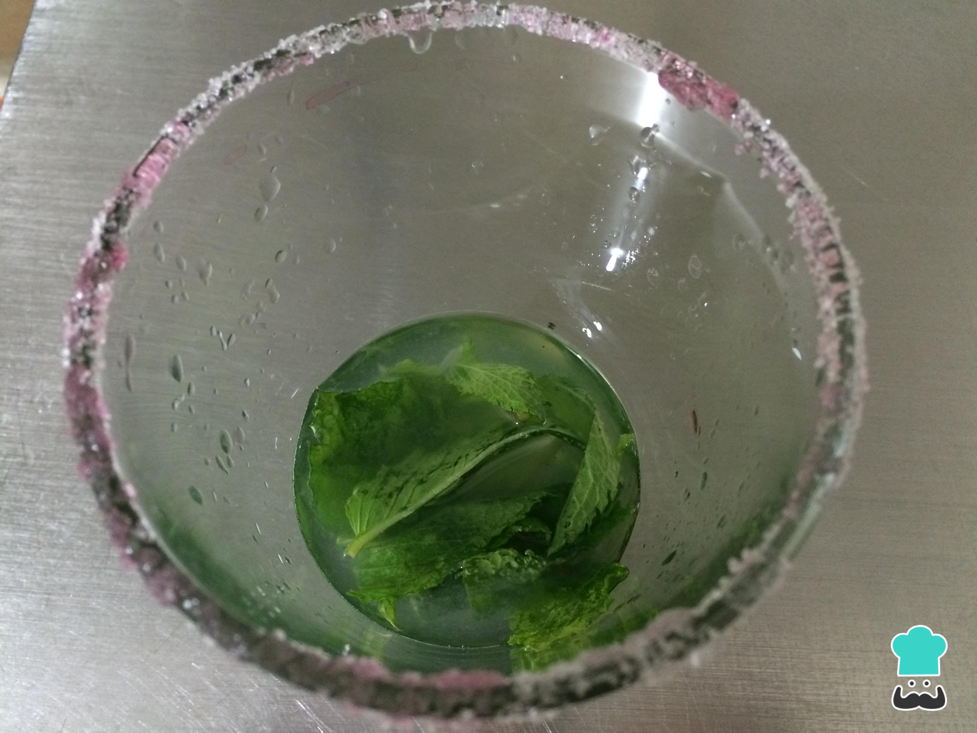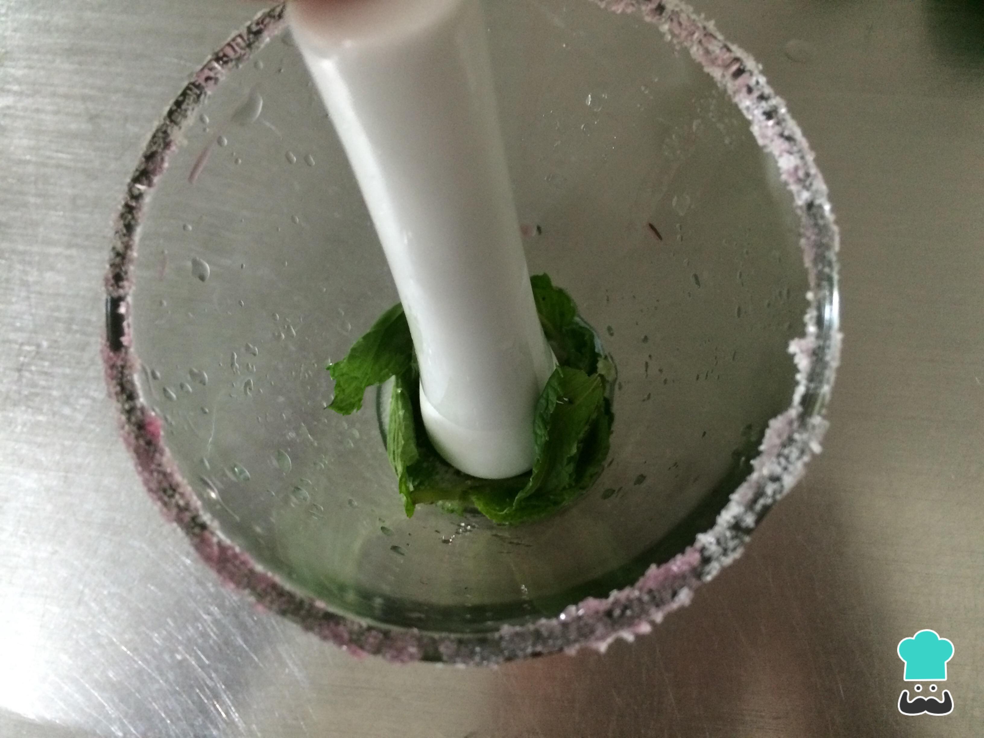 À parte, umedeça as bordas dos copos com suco de limão e polvilhe açúcar. Acrescente a hortelã, o restante açúcar e limão, e esmague com um socador durante cerca de 2 minutos, para libertar bem os sabores.