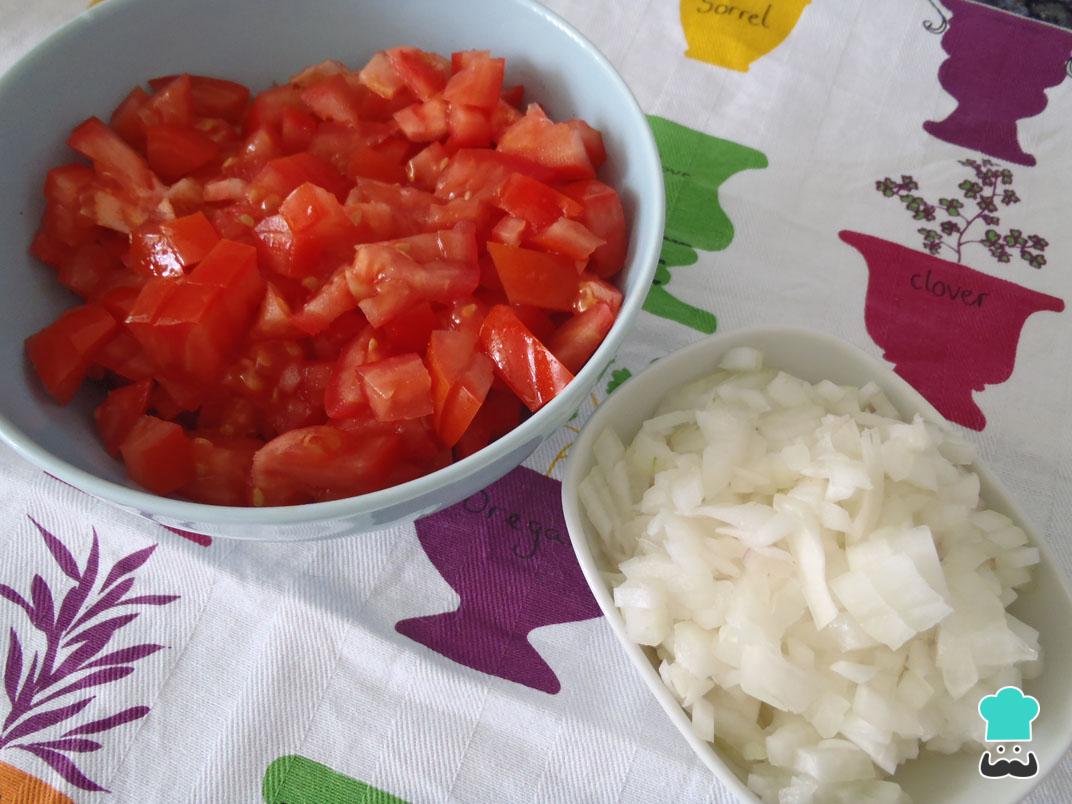 Preparar molho à campanha é bem simples! Comece por picar finamente a cebola, os tomates e a salsinha, separadamente.