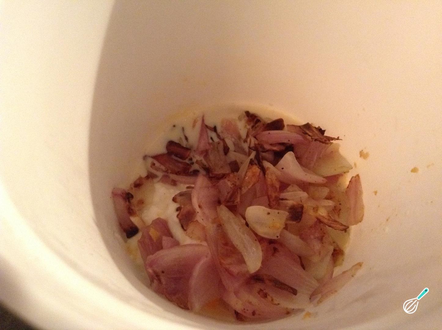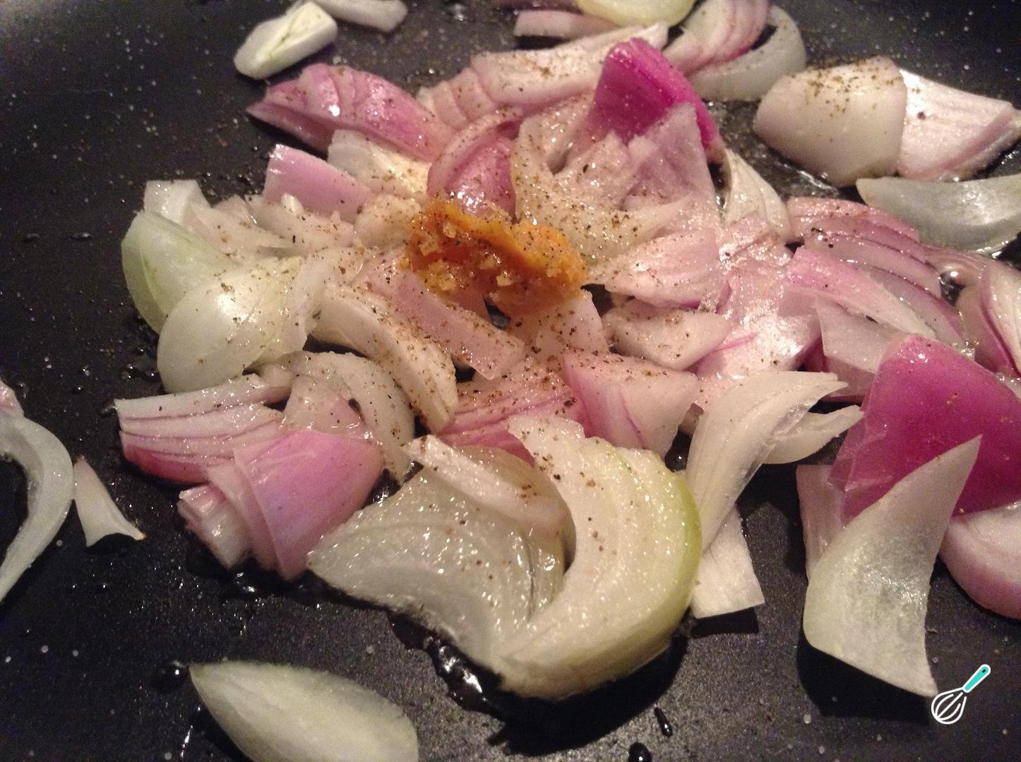 Corte a cebola em pétalas e refogue numa frigideira em fogo médio com um pouco de azeite. Tempere com sal, pimenta e pasta de alho a gosto, até que fique transparente.