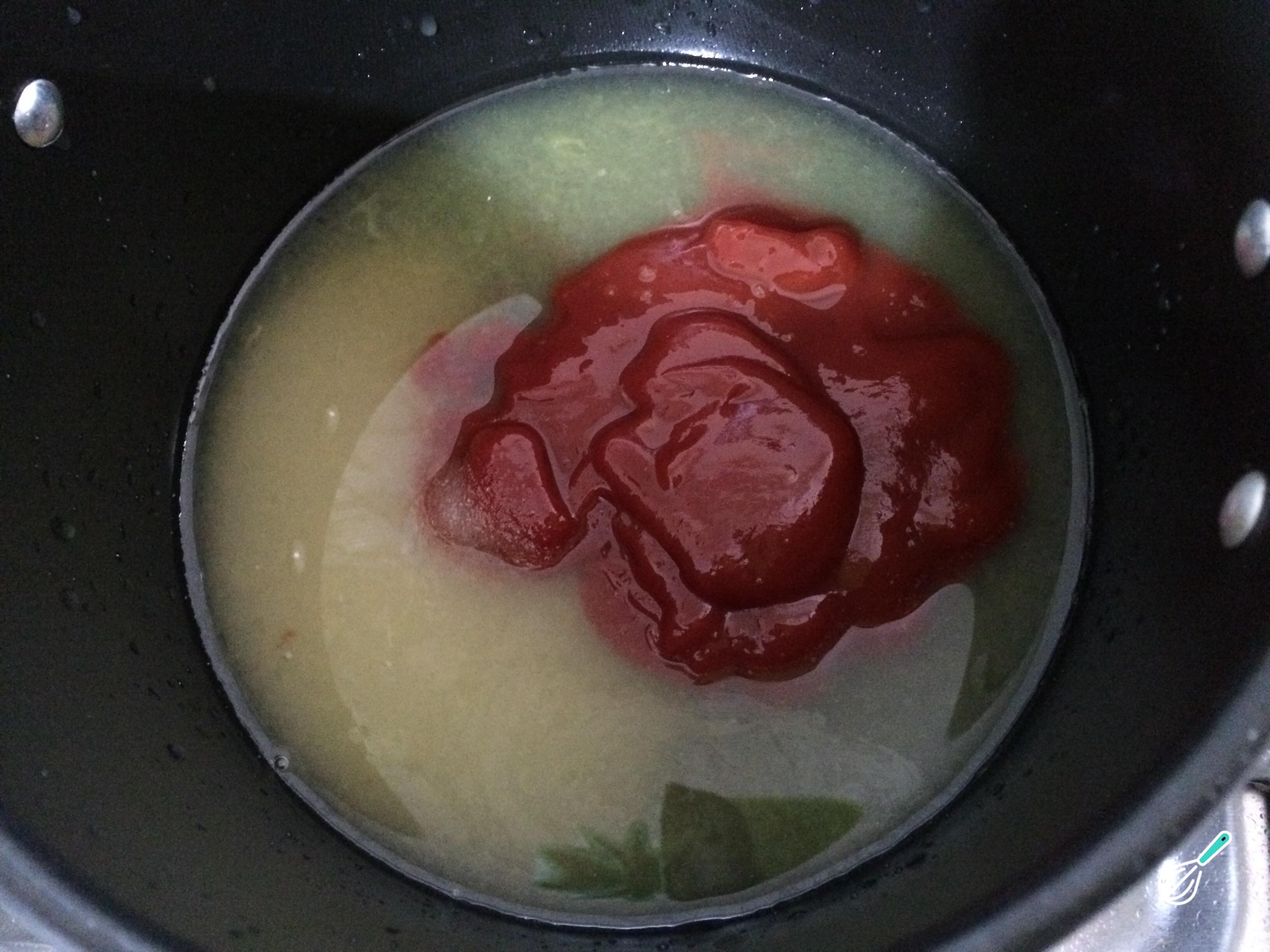 Numa panela coloque o suco do abacaxi em conserva, o açúcar, o vinagre, o ketchup e o shoyu ou tamari. Leve ao fogo médio e fique mexendo até dissolver todo o açúcar e a mistura começar a ferver.
