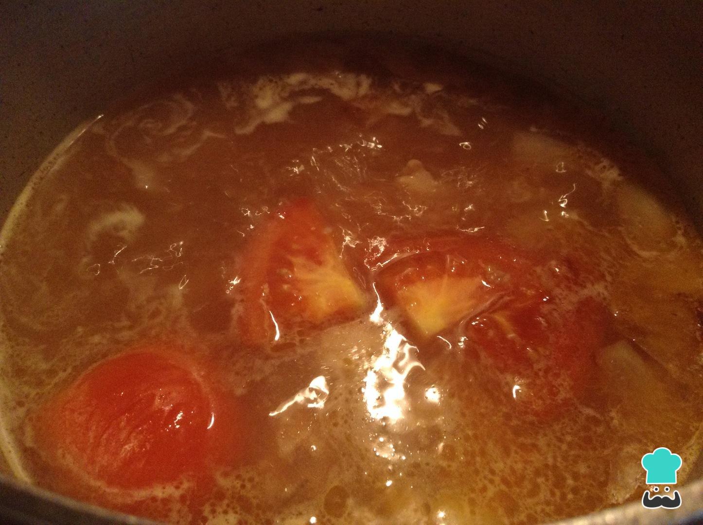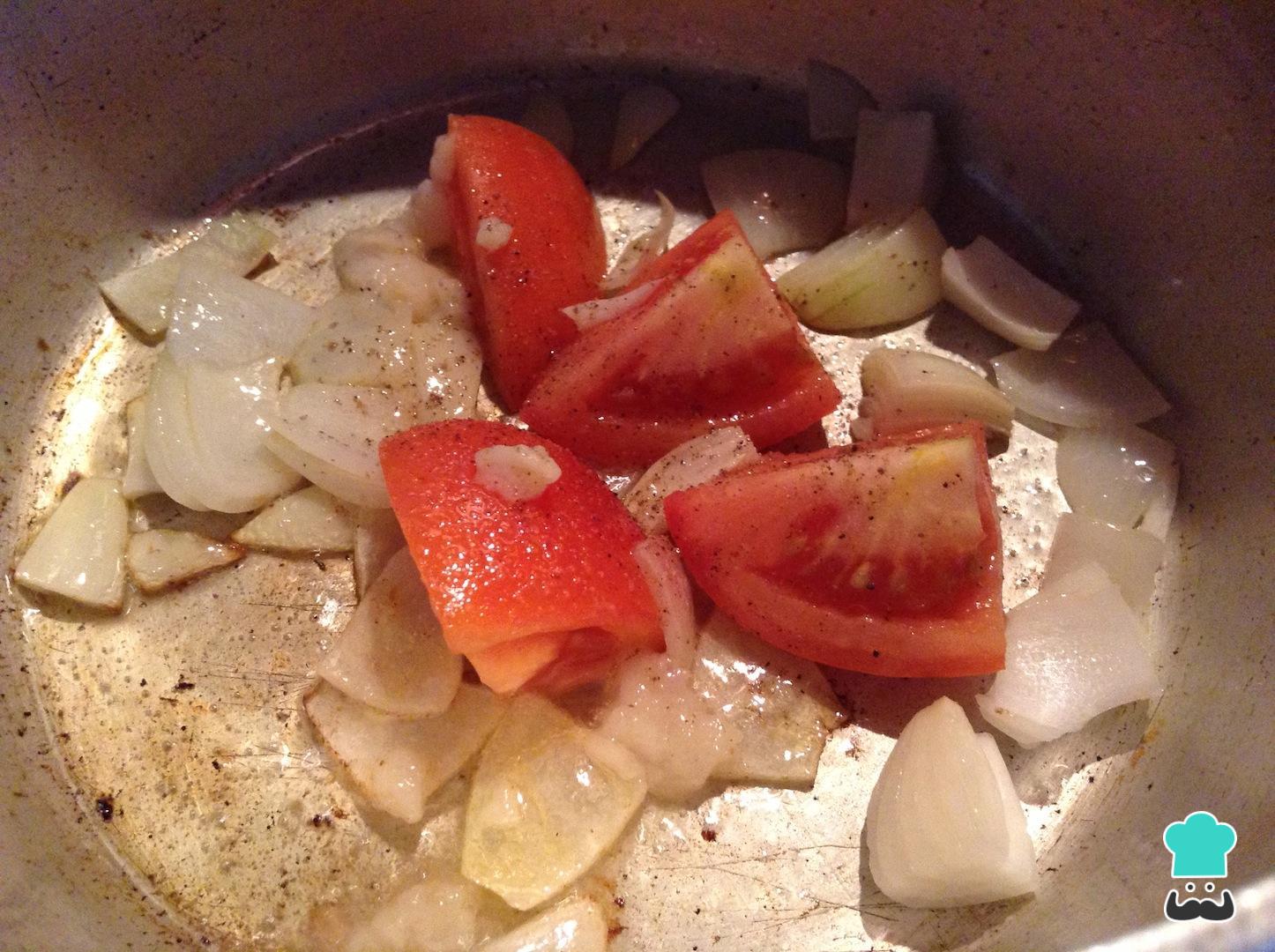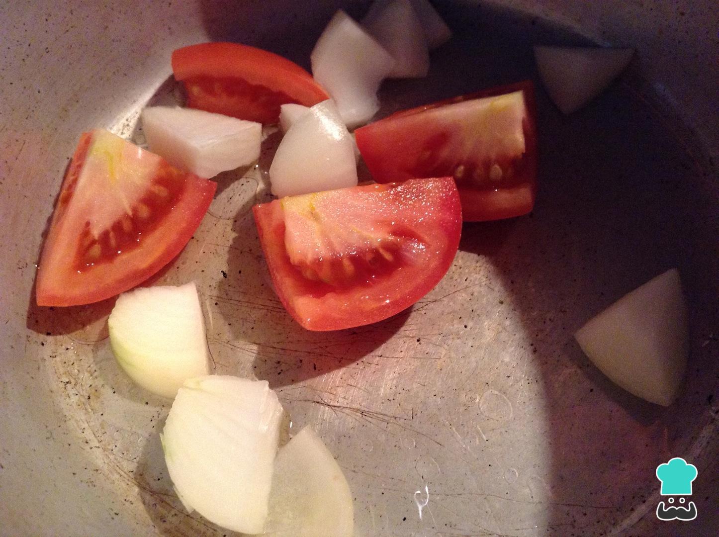 Leve ao fogo médio uma panela com o azeite de oliva. Quando estiver quente, acrescente os tomates e a cebola cortados como mostramos na fotografia.