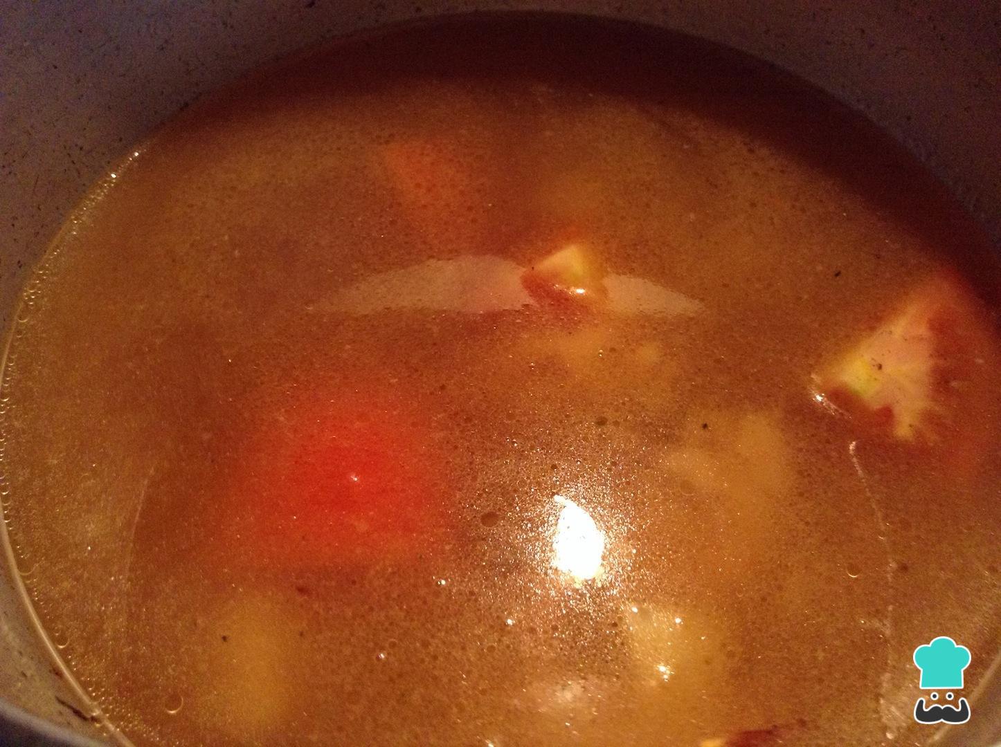 O passo seguinte do molho à americana é acrescentar o caldo de peixe e frutos do mar, que pode ser de compra ou caseiro.