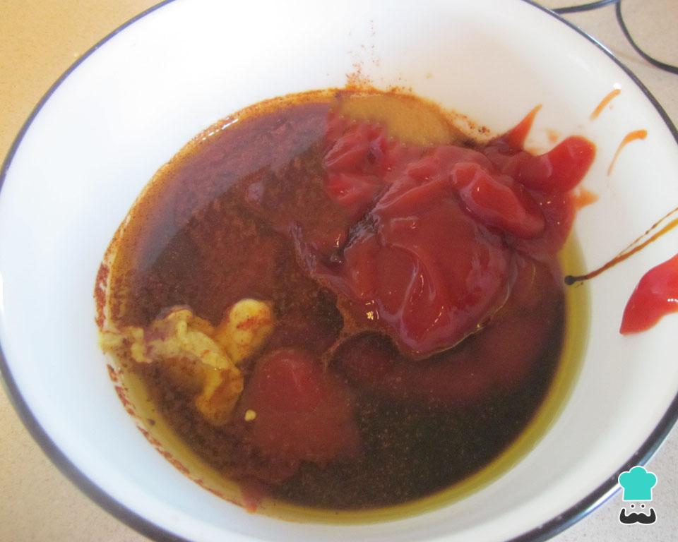 Numa tigela misture o ketchup, a mostarda e o mel ou açúcar.