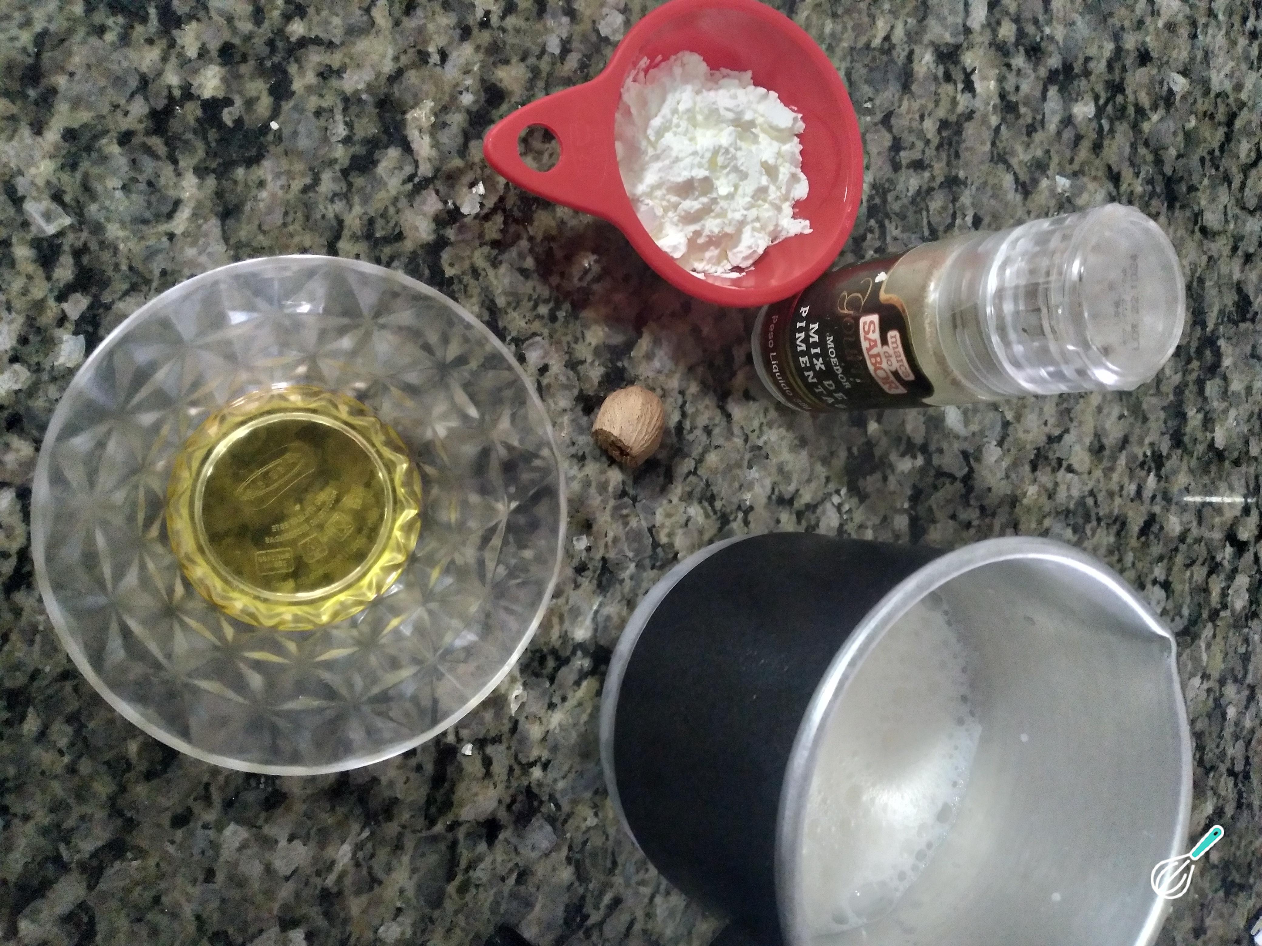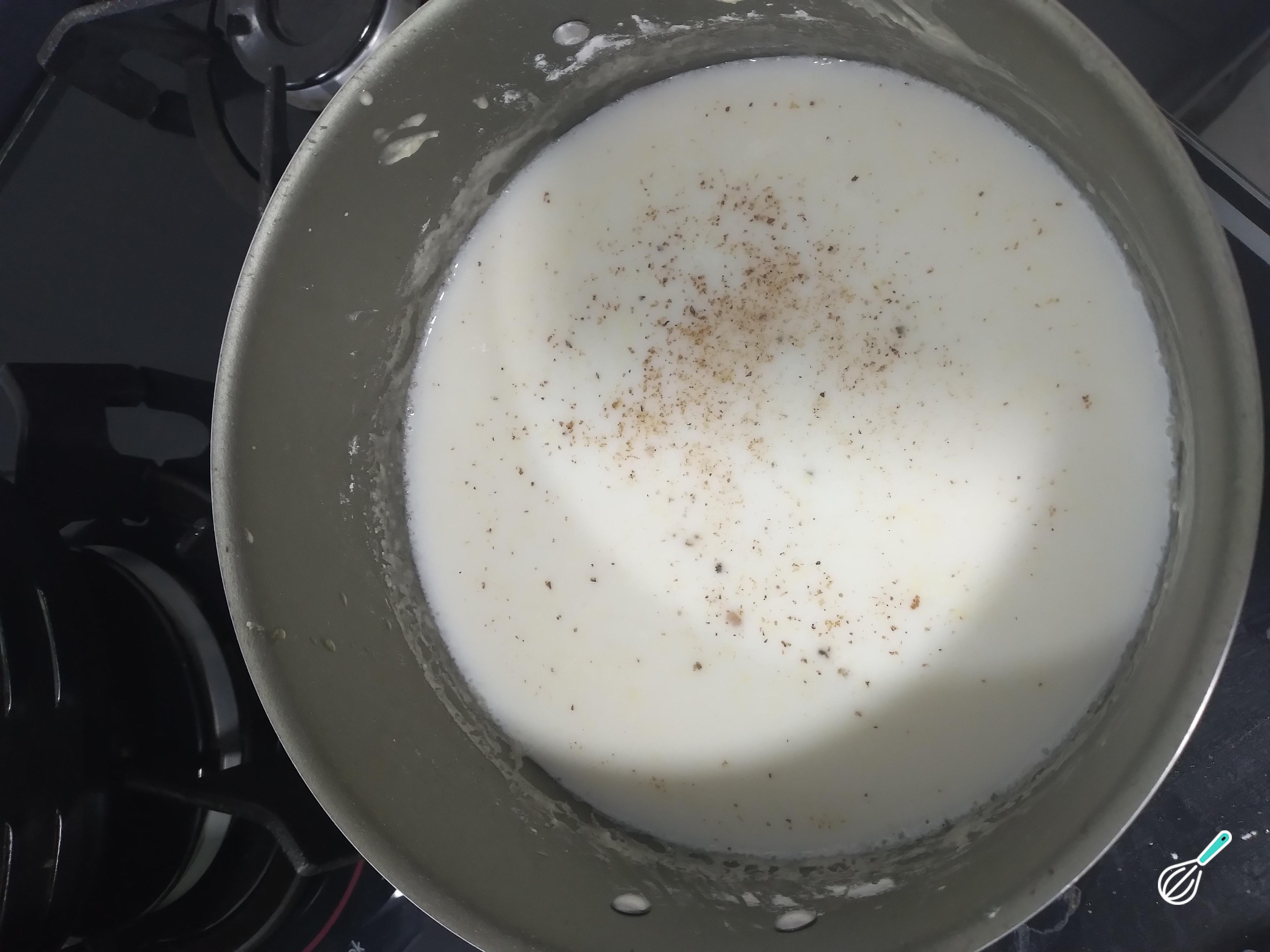 Com o liquido escolhido já na panela, vamos temperar com o sal, pimenta e a noz moscada.