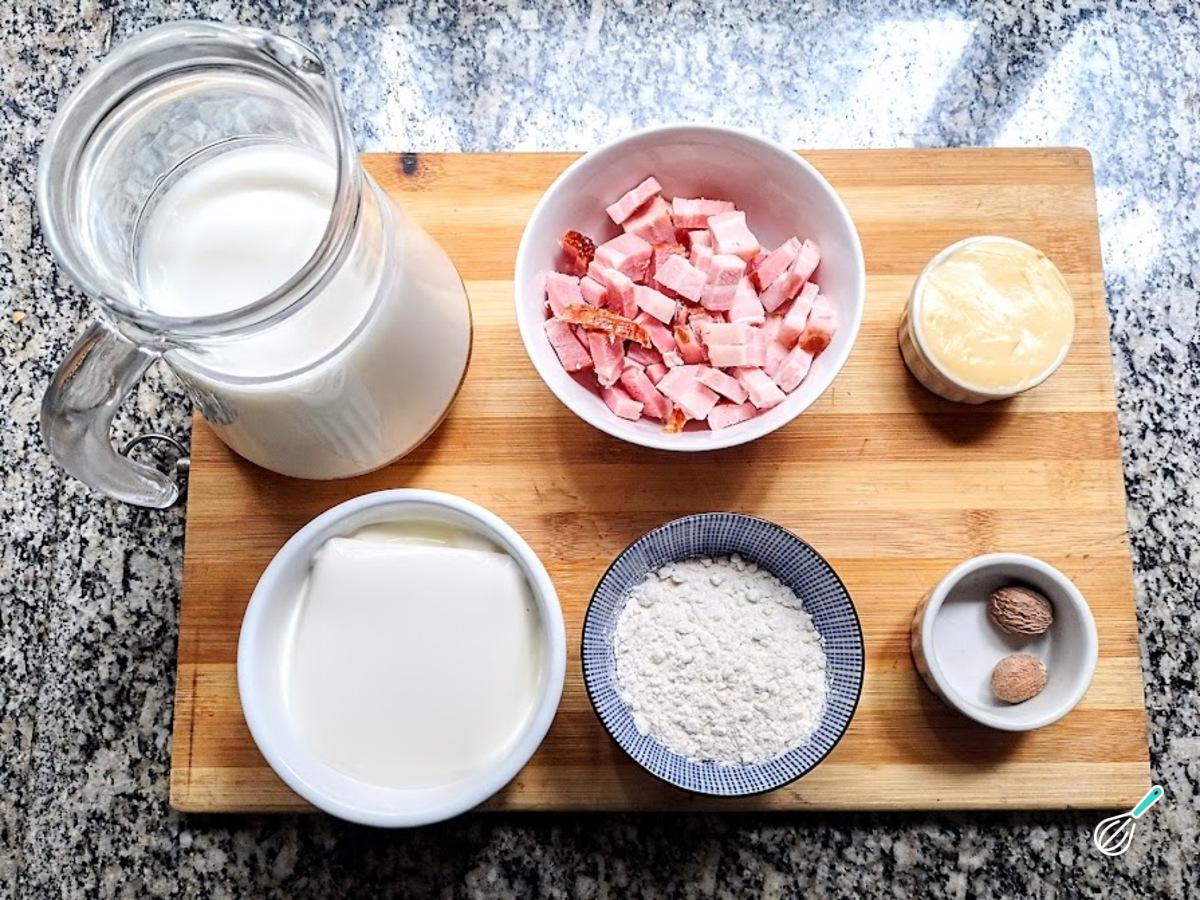 Separe todos os ingredientes que serão utilizados na preparação do molho branco com creme de leite.