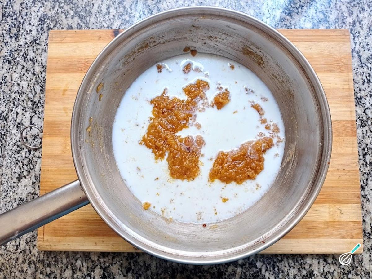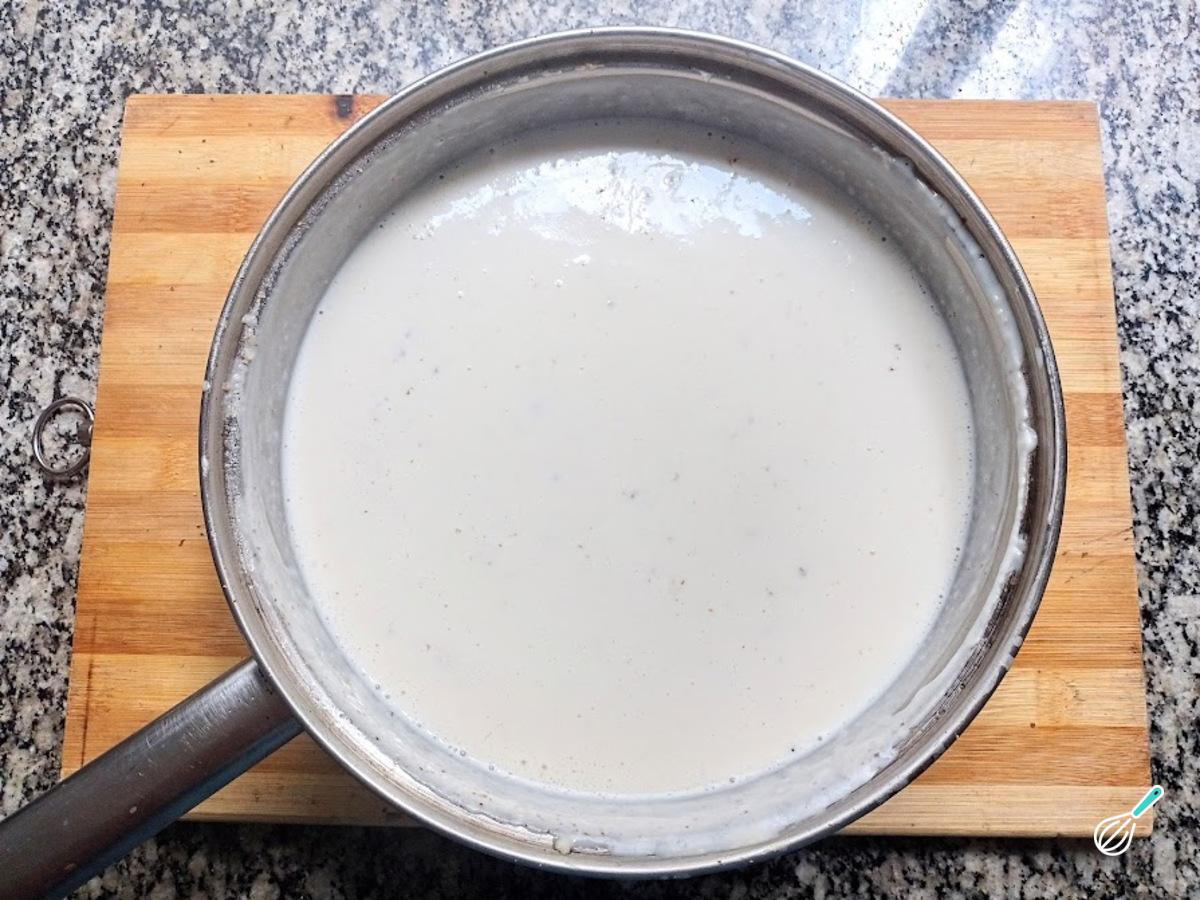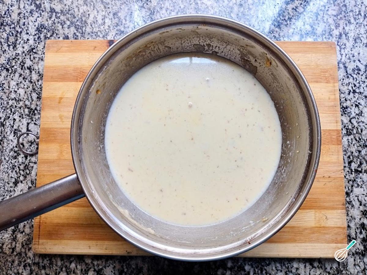 Após cozinhar por aproximadamente 03 minutos, o roux estará pronto para receber o leite. Deve cozinhar por alguns minutos, para deixar o gosto da farinha sobressalente.