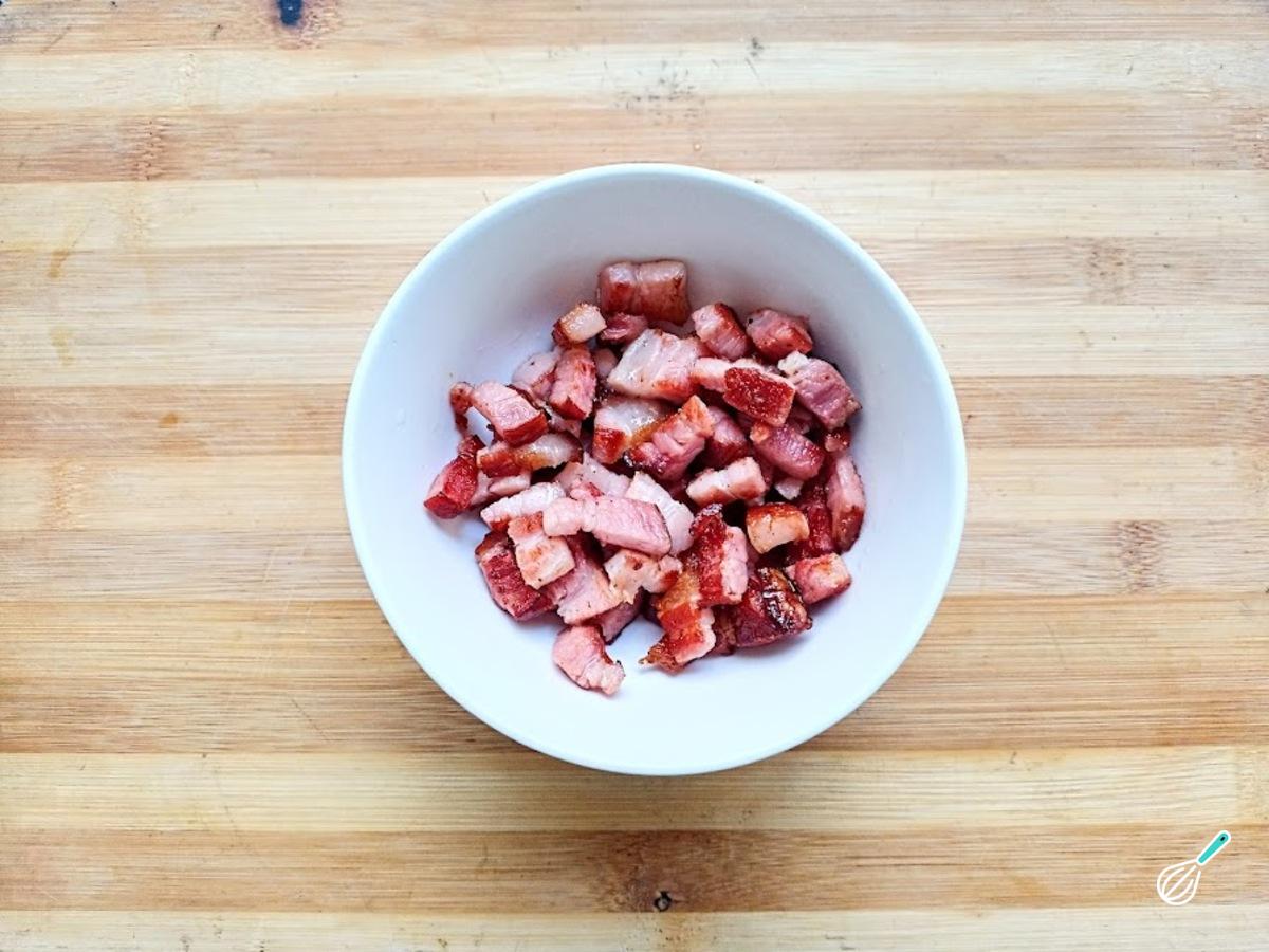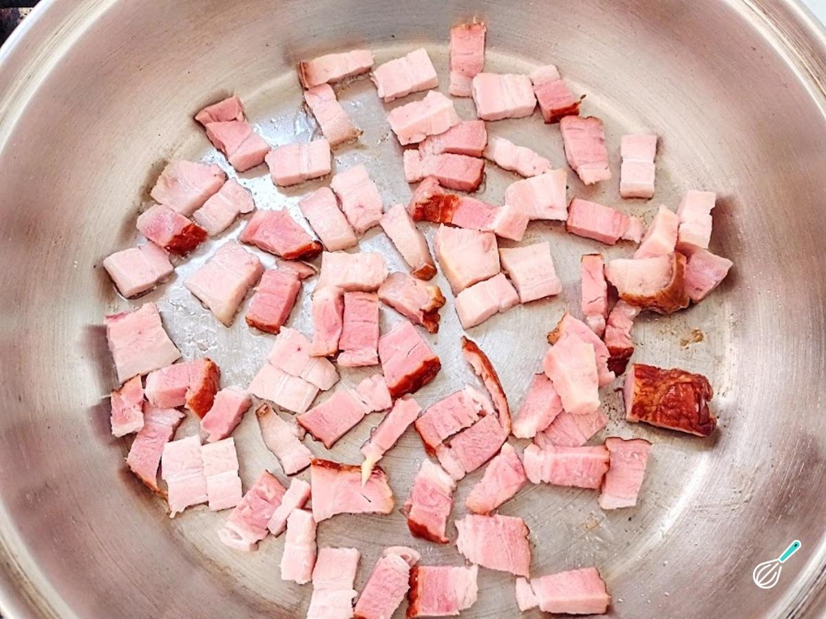 Coloque o bacon em pedaços, para fritar. Tomar cuidado para não ficarem queimados e deixar o fundo da frigideira escuro, pois neste caso, irá influenciar na aparência do molho.