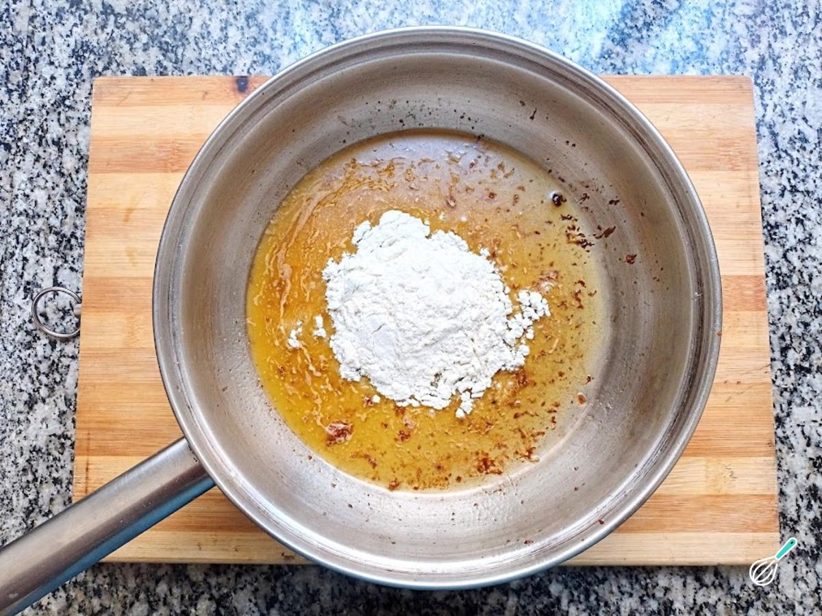 Após, colocar a farinha de trigo. Nessa fase, irá formar uma "massinha", o roux, que será o espessante do molho.