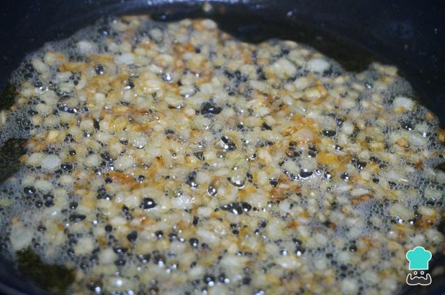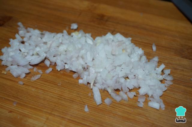 Quando a manteiga derreter ou o azeite esquentar, acrescente a cebola picada e deixe-a refogar até ficar douradinha (mexa de vez em quando para não queimar).