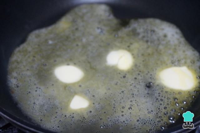 Leve ao fogo médio uma panela ou frigideira funda e coloque a manteiga e o azeite de oliva para esquentar.
