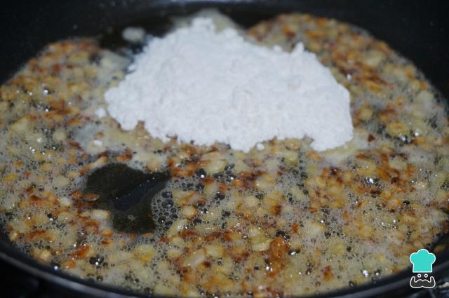 Quando a cebola estiver dourada, acrescente o trigo ou a maisena. Enquanto isso, esquente o leite no microondas ou noutra panela até ficar quente (não precisa ferver).
