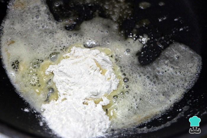Para fazer este molho branco caseiro comece por levar ao fogo uma panela com a manteiga e a farinha. Fique mexendo até a manteiga derreter e virar uma pasta junto com a farinha.
