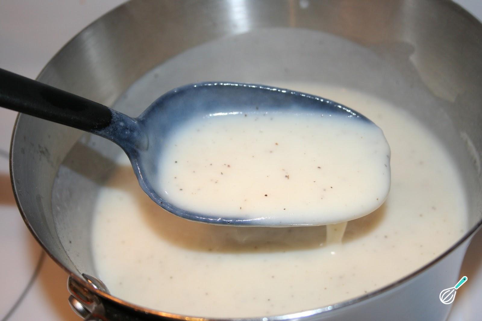 Deixe cozinhar por alguns minutos até ficar consistente. Quando conseguir a espessura desejada, tempere com sal e junte o creme de leite. Misture tudo muito bem e aqueça, sem nunca deixar o molho branco ferver.