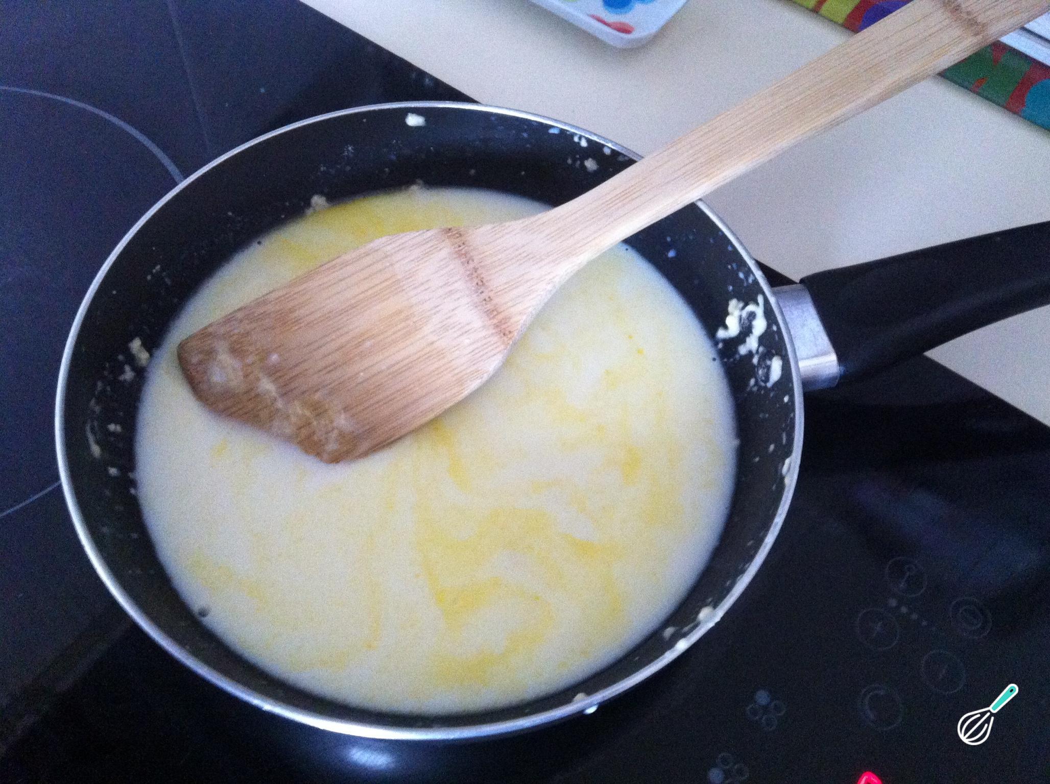 Em seguida adicione o leite gradualmente, para não criar grumos, e misture continuamente. Adicione sal a gosto e aumente o fogo até ferver.