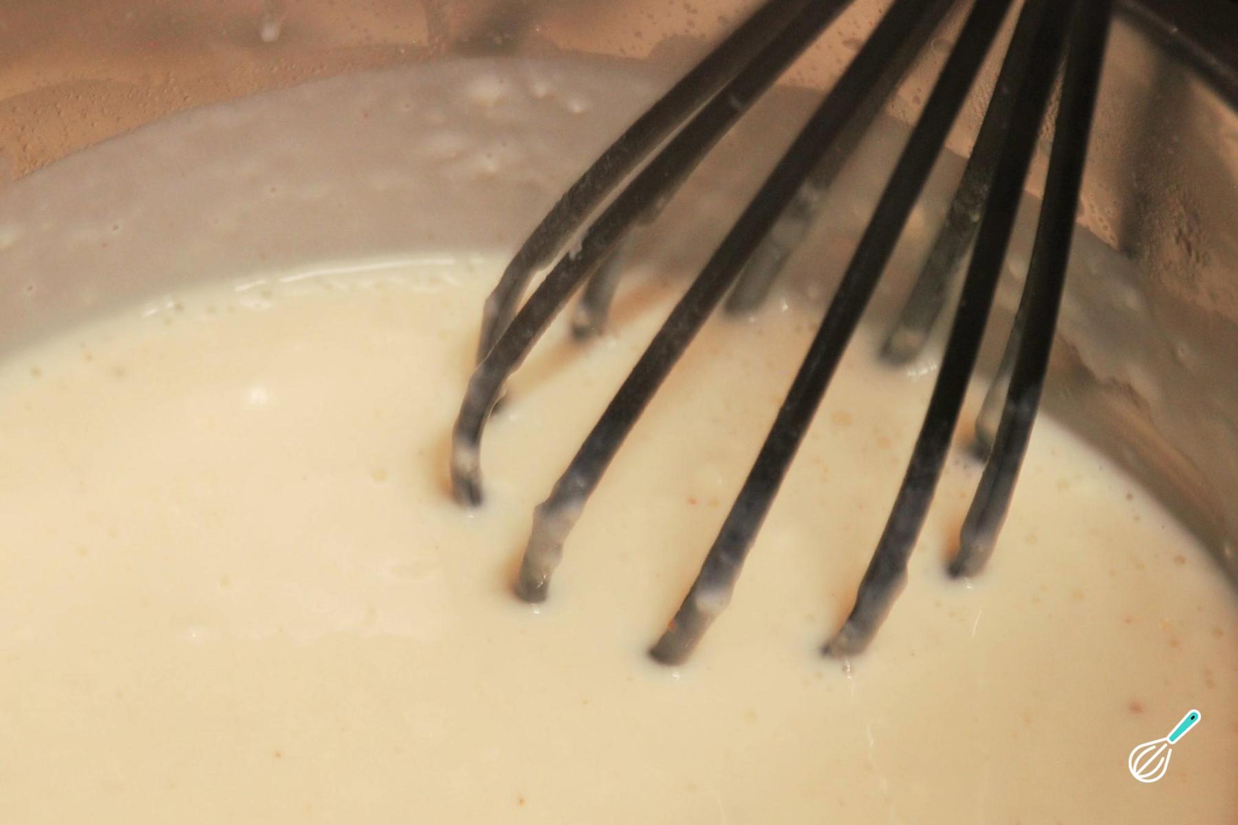 Não pare de mexer o molho branco com um batedor, até sentir que está começando a engrossar. Não é preciso mexer muito rápido, basta garantir que não gruda no fundo.